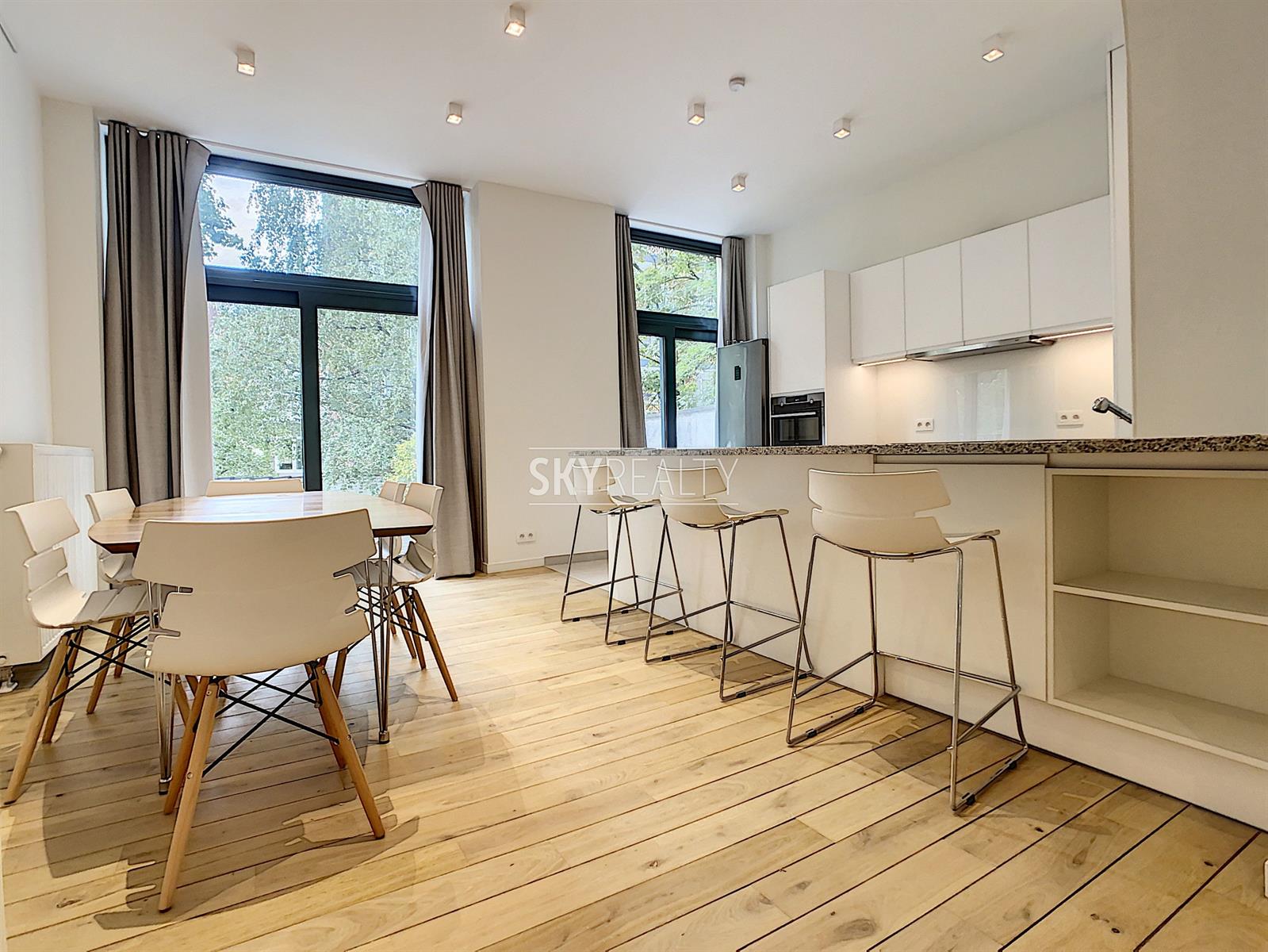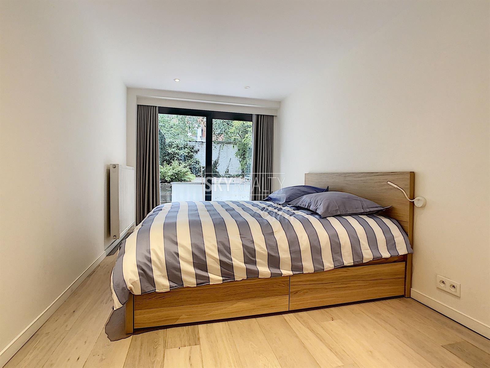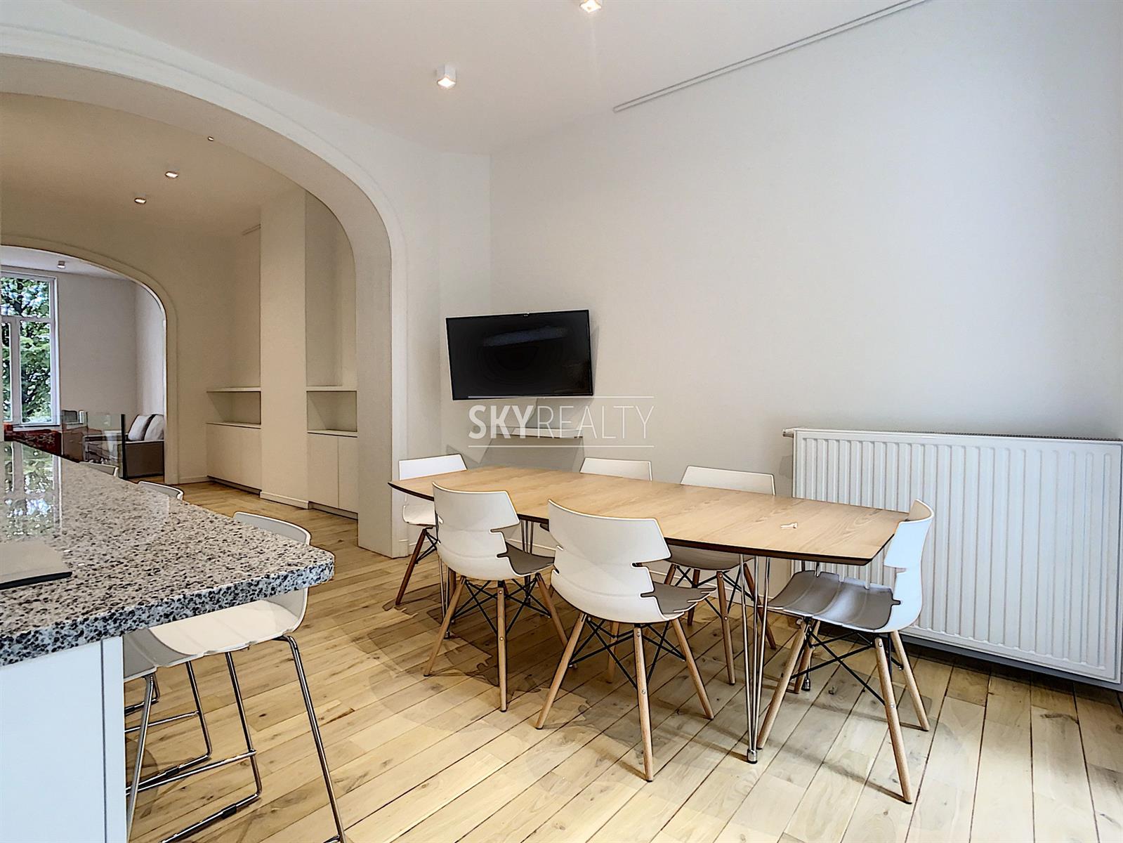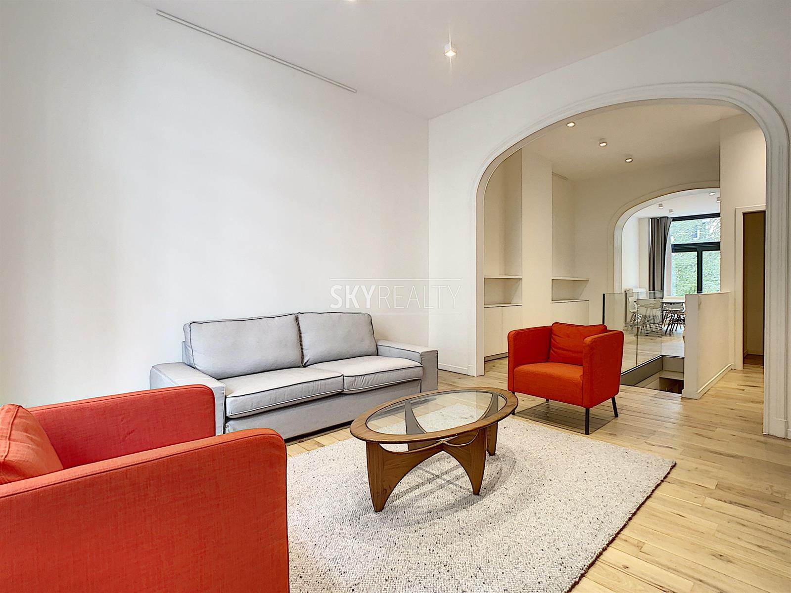 SCHUMAN / EUROPEAN DISTRICT: Ideally located next to Square Ambiorix and close to public transport and all facilities, this splendid 2 bedroom furnished duplex apartment of 110 sqm on the upper floor of a pretty mansion will enchant you by its beautiful volumes, the quality of its renovation and its pleasant garden. First occupation after complete renovation. It offers: a guest toilet (with washbasin), a living room made up of 3 interconnecting rooms giving access to the rear to a beautiful terrace and a pleasant sunken garden (west facing), a spacious fully equipped American kitchen with friendly central island (fridge-freezer, induction hob, extractor, oven, dishwasher, lots of storage); on the lower floor: a night hall, a guest toilet, two large bedrooms (20 and 18 sqm), two en-suite bathrooms (shower, sink, towel radiator), a space with washing machine and dryer (included), access to the garden via the two bedrooms. Bicycles / strollers room. Double glazing, high ceilings, oak parquet, custom furniture, room thermostat, ventilation system, magnetic key, etc. Prime location 300m from Schuman near transport (metro, bus, trains, taxis) and all services (shops, supermarkets, restaurants, etc.). Parc du Cinquantenaire 3 min. walk. Easy access to highways. Rent € 1,750 € and no common charges. Separate meters for water gas electricity. Free immediately. Info & visits: David: 0495 511 555.