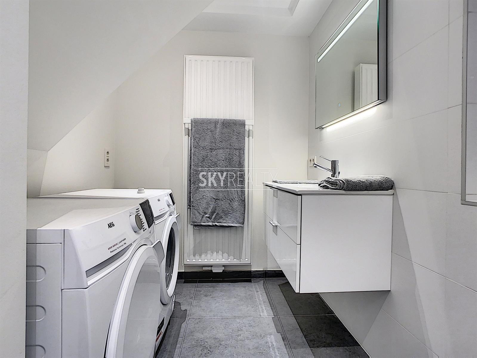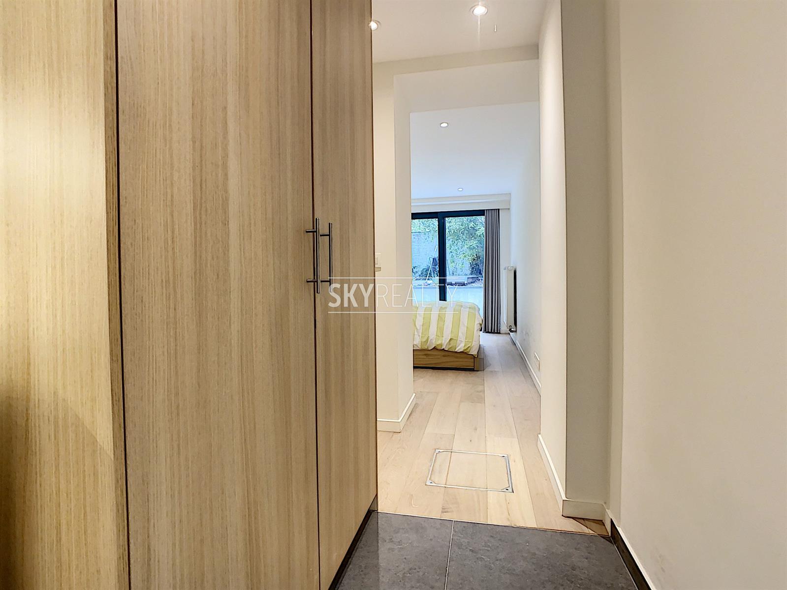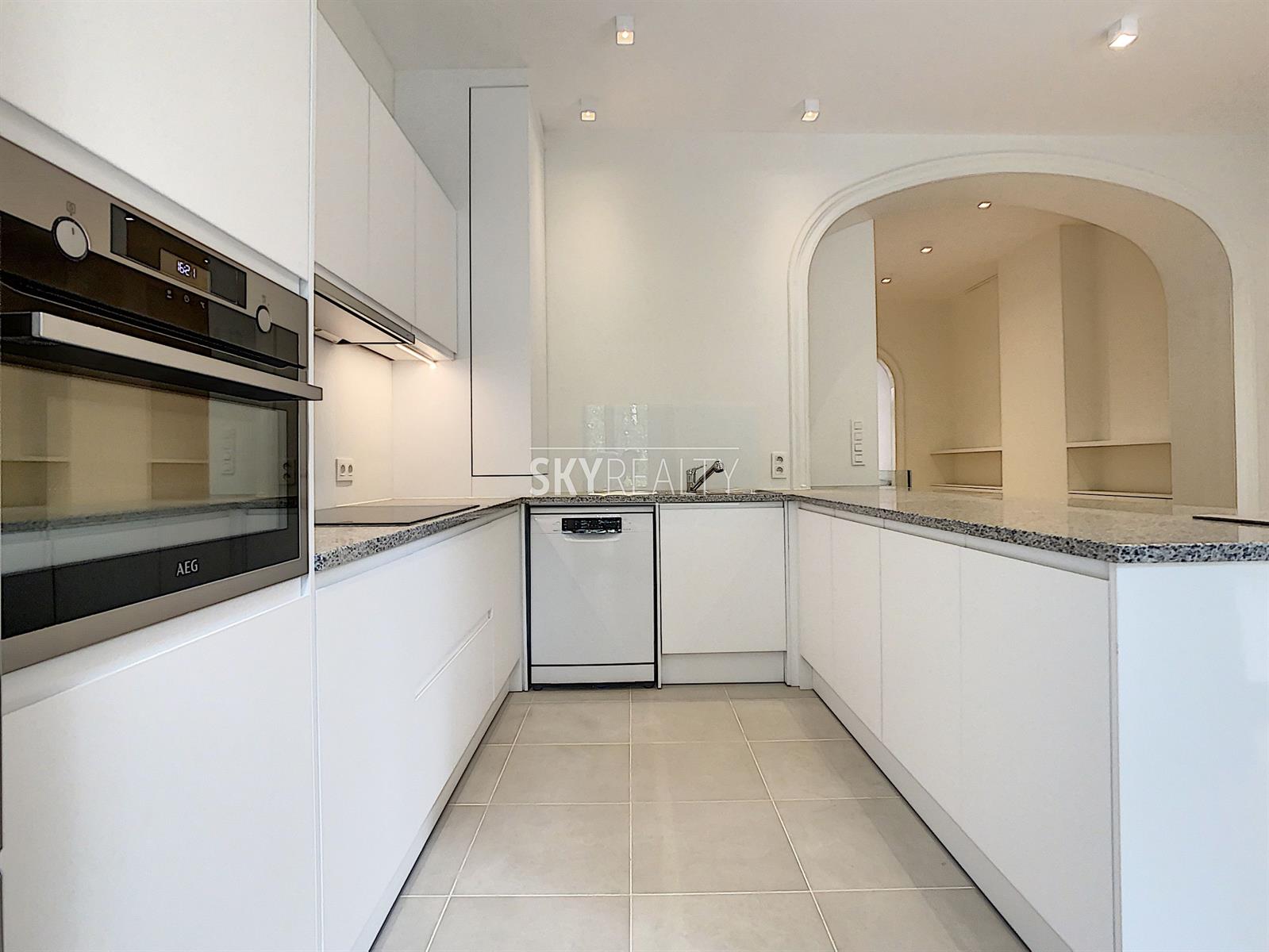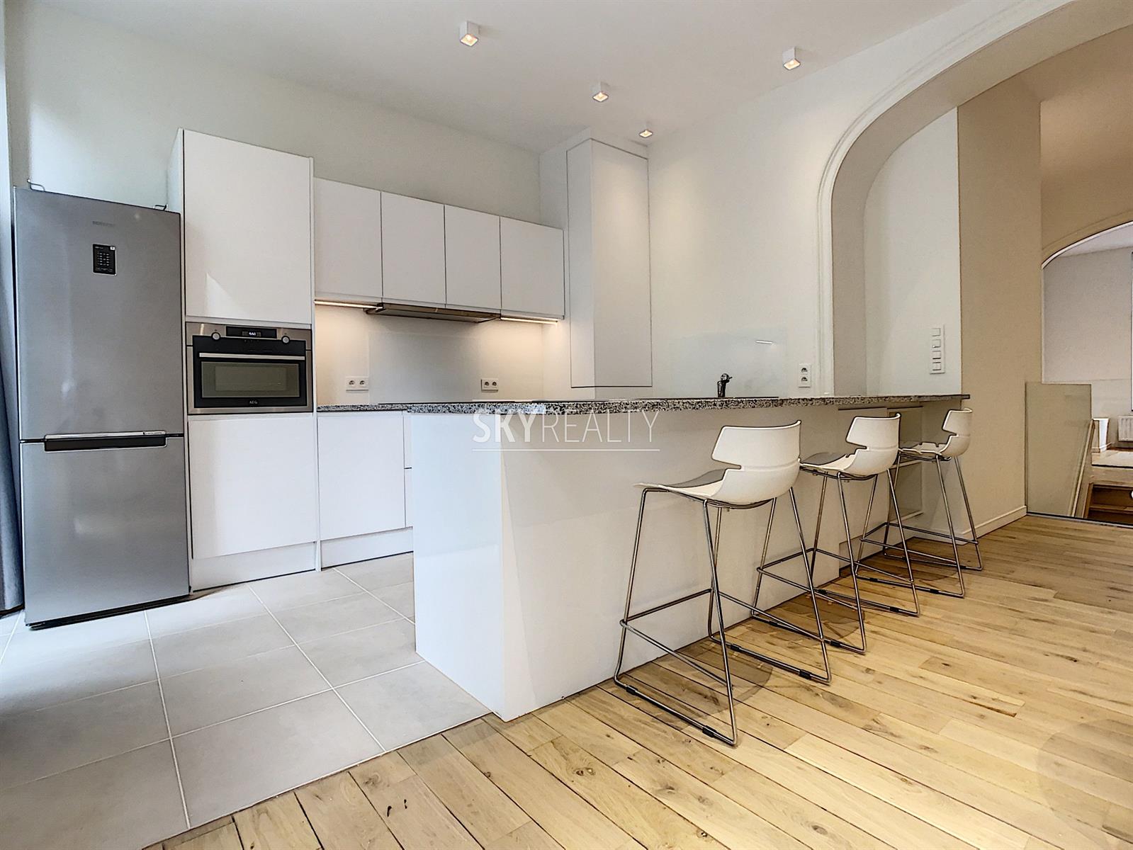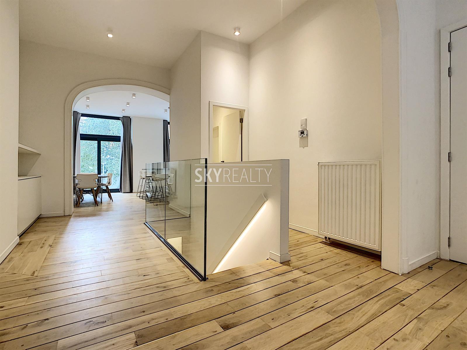 SCHUMAN / EUROPEAN DISTRICT: Ideally located next to Square Ambiorix and close to public transport and all facilities, this splendid 2 bedroom furnished duplex apartment of 110 sqm on the upper floor of a pretty mansion will enchant you by its beautiful volumes, the quality of its renovation and its pleasant garden. First occupation after complete renovation. It offers: a guest toilet (with washbasin), a living room made up of 3 interconnecting rooms giving access to the rear to a beautiful terrace and a pleasant sunken garden (west facing), a spacious fully equipped American kitchen with friendly central island (fridge-freezer, induction hob, extractor, oven, dishwasher, lots of storage); on the lower floor: a night hall, a guest toilet, two large bedrooms (20 and 18 sqm), two en-suite bathrooms (shower, sink, towel radiator), a space with washing machine and dryer (included), access to the garden via the two bedrooms. Bicycles / strollers room. Double glazing, high ceilings, oak parquet, custom furniture, room thermostat, ventilation system, magnetic key, etc. Prime location 300m from Schuman near transport (metro, bus, trains, taxis) and all services (shops, supermarkets, restaurants, etc.). Parc du Cinquantenaire 3 min. walk. Easy access to highways. Rent € 1,750 € and no common charges. Separate meters for water gas electricity. Free immediately. Info & visits: David: 0495 511 555.