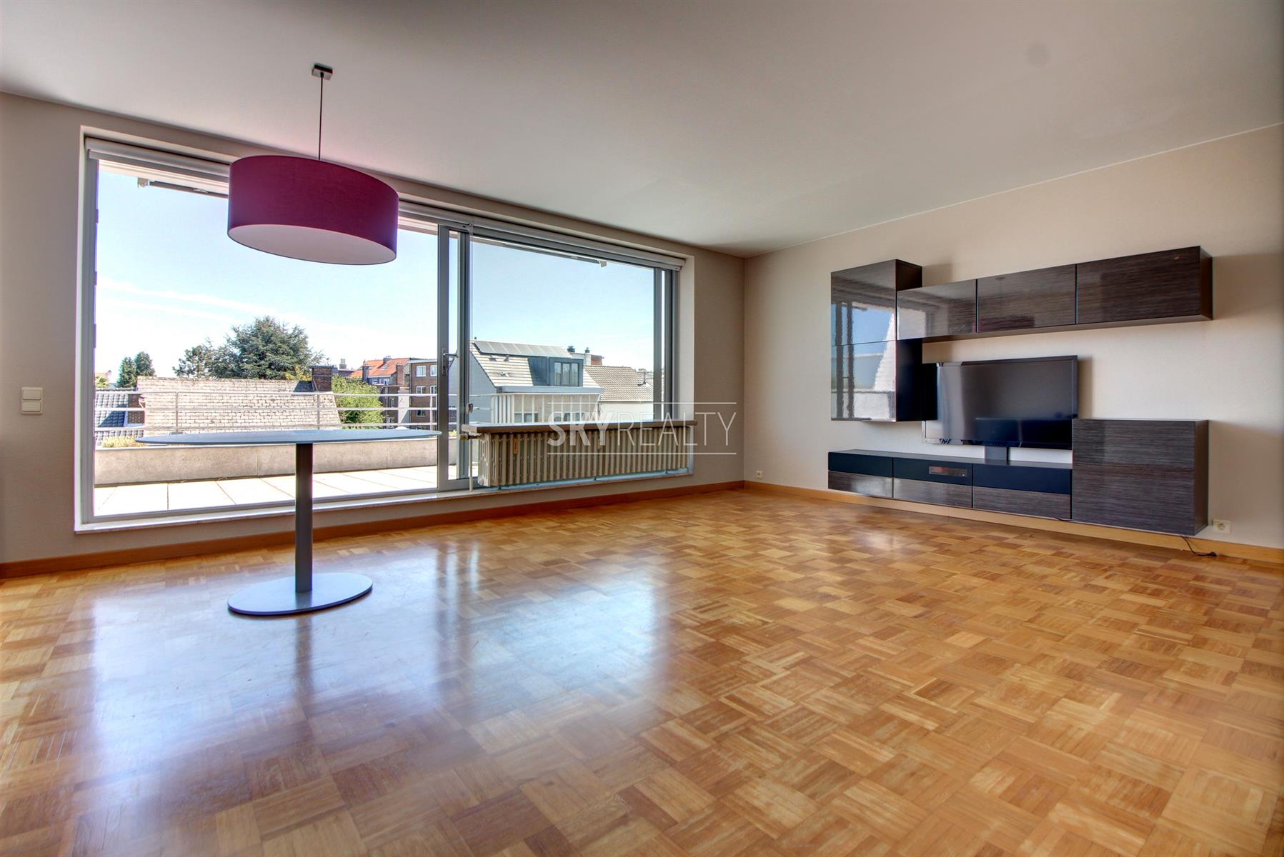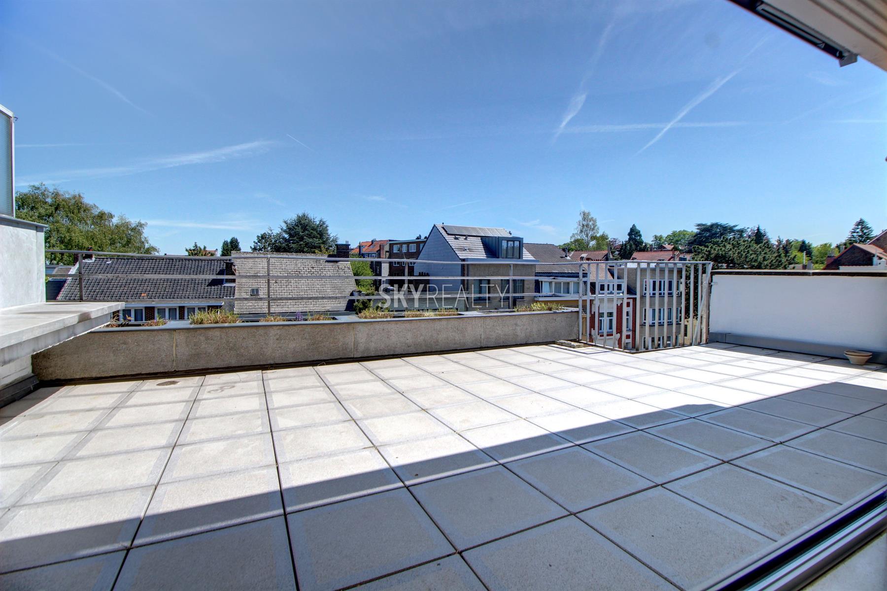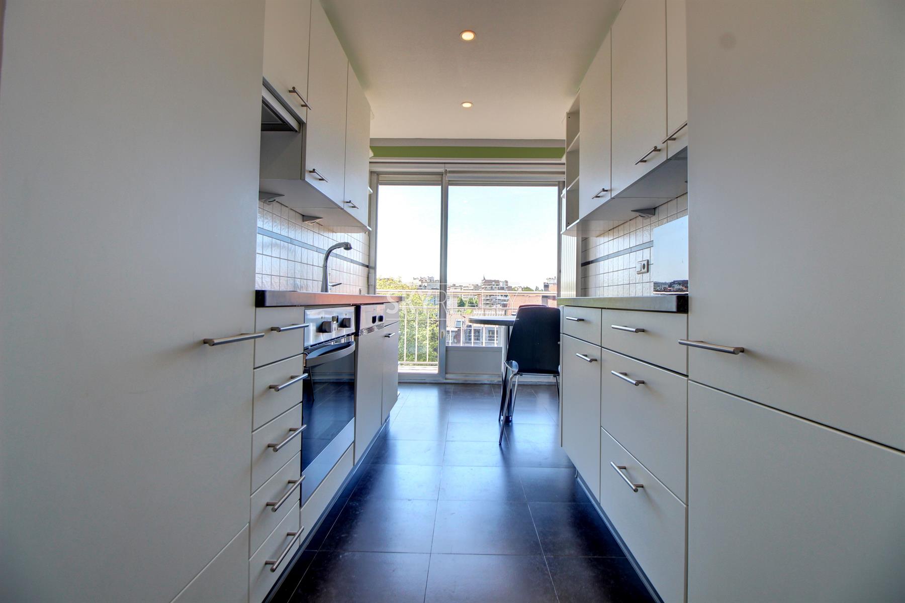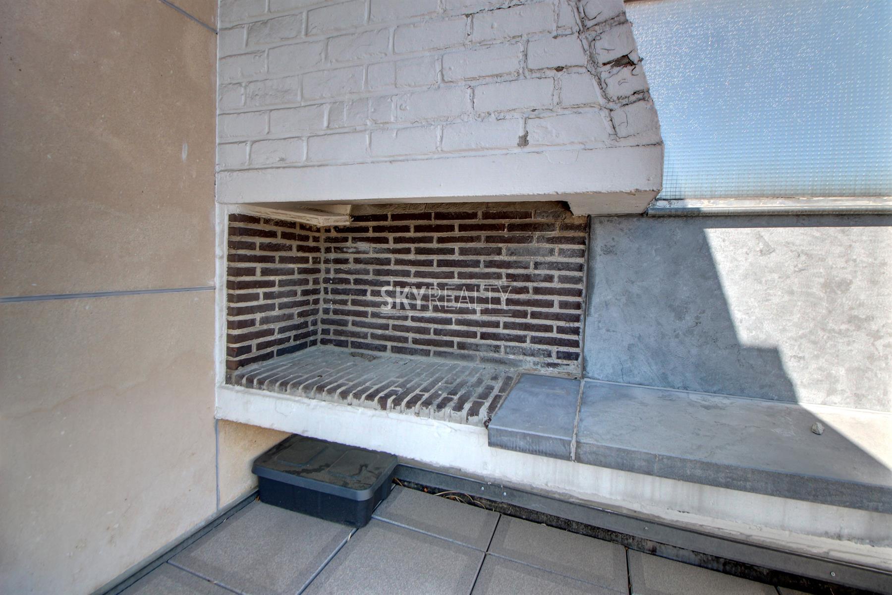 *** R E N T E D *** Gribaumont / Josephine Charlotte: Ideally located in a small condominium, in a quiet place but close to the metro and all facilities, this beautiful 2 bedroom penthouse of 90 sqm will seduce you with its nice amenities. It offers: an entrance hall with cloakroom, a guest toilet, a living room (parquet and open fire) opening onto a pleasant terrace with a nice view and equipped with an open fire (ideal for barbecues), a fully equipped kitchen (fridge, ceramic hob, extractor, oven, microwave, dishwasher), night hall, 2 large bedrooms, 1 bathroom (bath, washbasin, programmable towel radiator), an en-suite shower (shower, sink, toilet), laundry room (washing machine included), cellar, large garage box (automatic door with remote control) in the basement accessible by elevator. The bedrooms and the kitchen give access to the second terrace. Possibility to sublet the garage. Nice amenities: Alarm, 2 bathrooms, 2 toilets, 2 terraces, double glazing throughout, solid oak flooring (bedrooms and living room), carrara marble in the hall, solar tent and open fire on the terrace, etc. Only one apartment on the landing (privacy guaranteed). Apartment rented semi furnished (tables, chairs, furniture with integrated TV & home cinema, library, bed frames with box spring and large wardrobe in the master bedroom). Option 100% furnished possible. Rent 1350 € (garage included) + 120 € charges (provision for heating, water and common area maintenance fees).