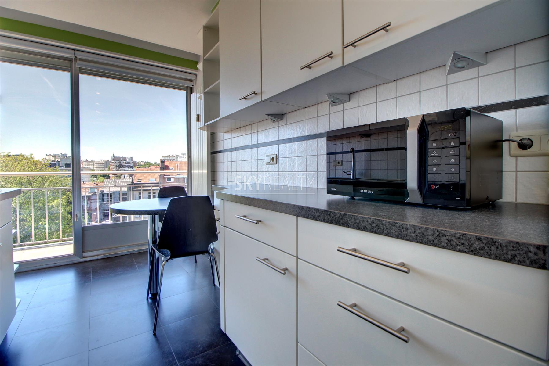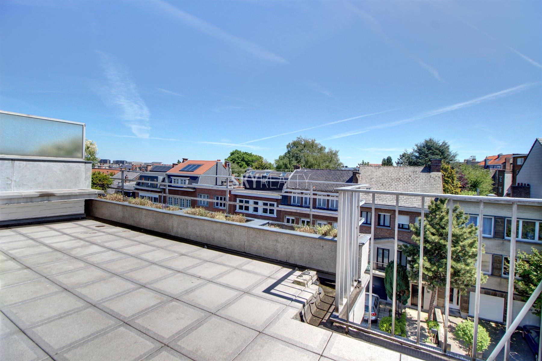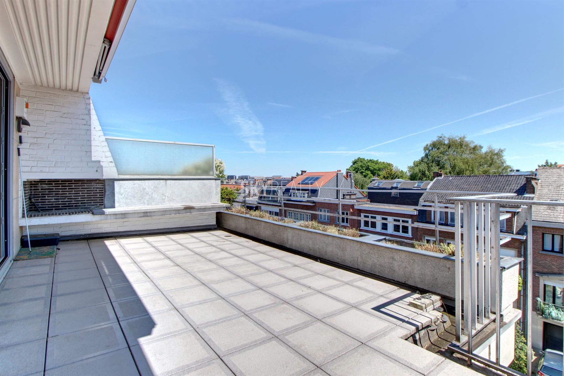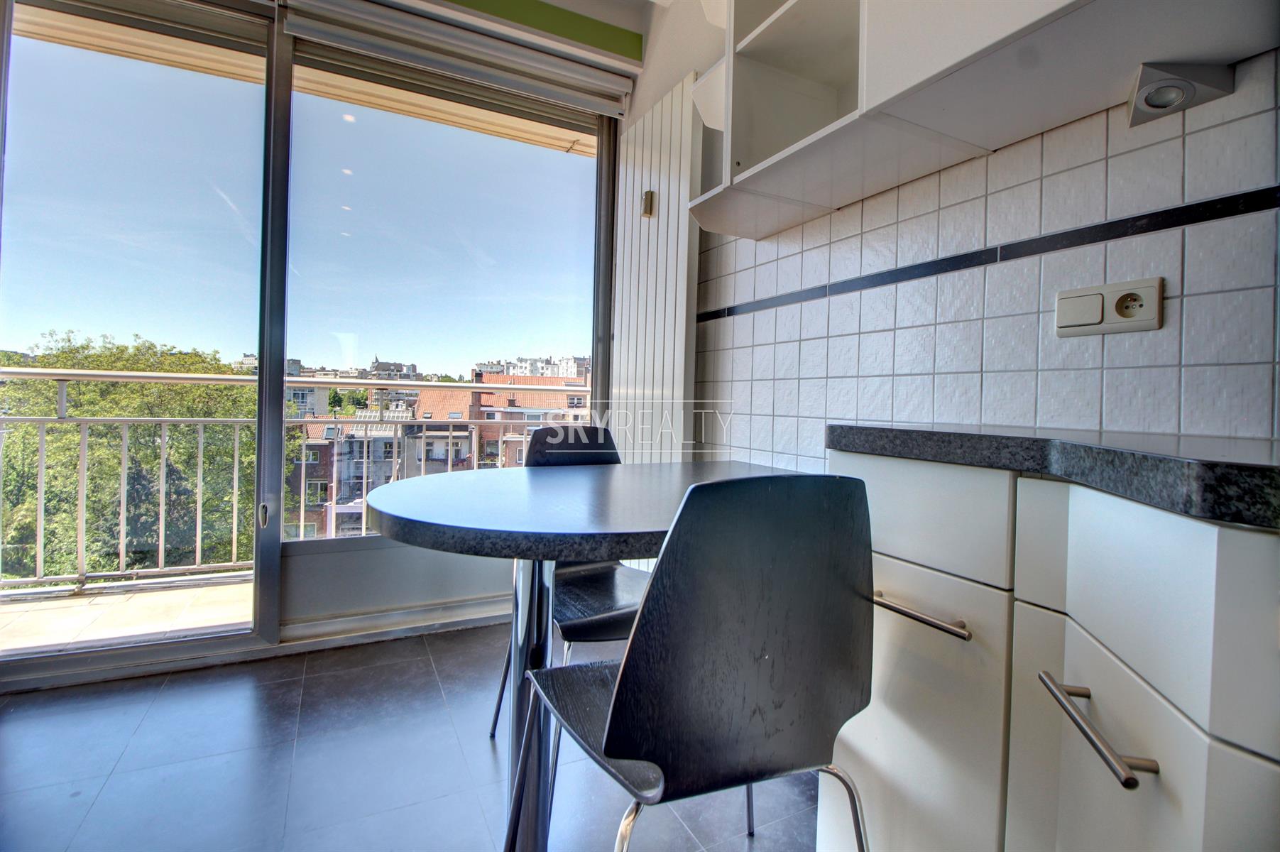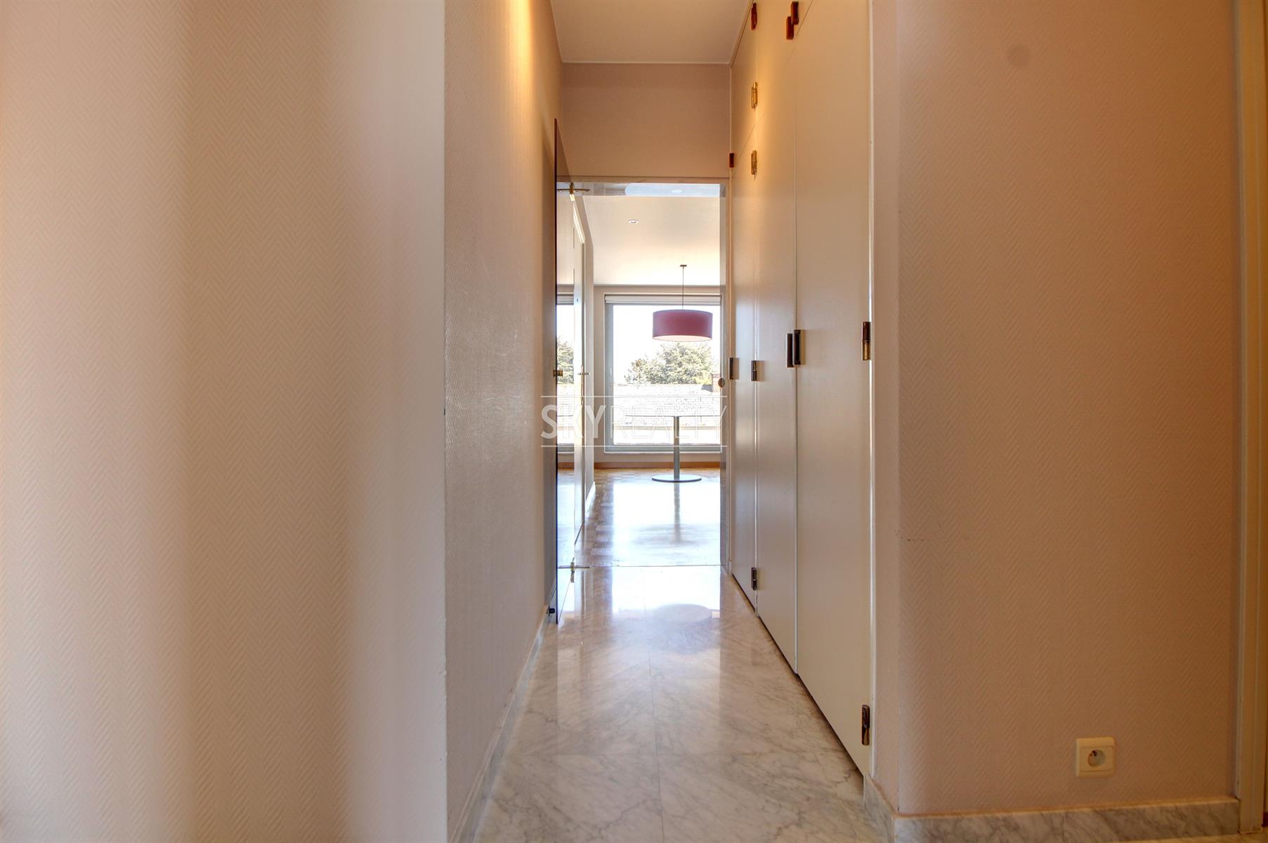 *** R E N T E D *** Gribaumont / Josephine Charlotte: Ideally located in a small condominium, in a quiet place but close to the metro and all facilities, this beautiful 2 bedroom penthouse of 90 sqm will seduce you with its nice amenities. It offers: an entrance hall with cloakroom, a guest toilet, a living room (parquet and open fire) opening onto a pleasant terrace with a nice view and equipped with an open fire (ideal for barbecues), a fully equipped kitchen (fridge, ceramic hob, extractor, oven, microwave, dishwasher), night hall, 2 large bedrooms, 1 bathroom (bath, washbasin, programmable towel radiator), an en-suite shower (shower, sink, toilet), laundry room (washing machine included), cellar, large garage box (automatic door with remote control) in the basement accessible by elevator. The bedrooms and the kitchen give access to the second terrace. Possibility to sublet the garage. Nice amenities: Alarm, 2 bathrooms, 2 toilets, 2 terraces, double glazing throughout, solid oak flooring (bedrooms and living room), carrara marble in the hall, solar tent and open fire on the terrace, etc. Only one apartment on the landing (privacy guaranteed). Apartment rented semi furnished (tables, chairs, furniture with integrated TV & home cinema, library, bed frames with box spring and large wardrobe in the master bedroom). Option 100% furnished possible. Rent 1350 € (garage included) + 120 € charges (provision for heating, water and common area maintenance fees).