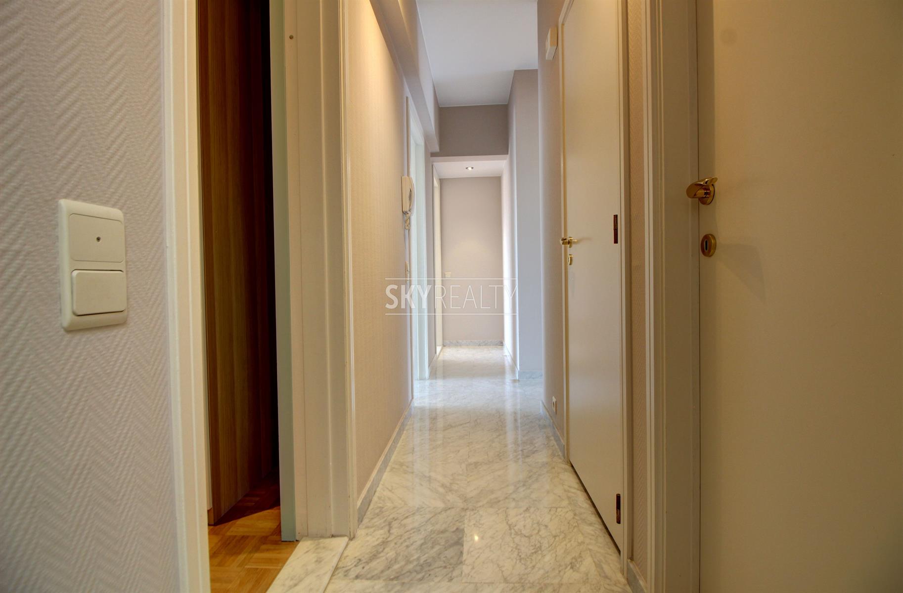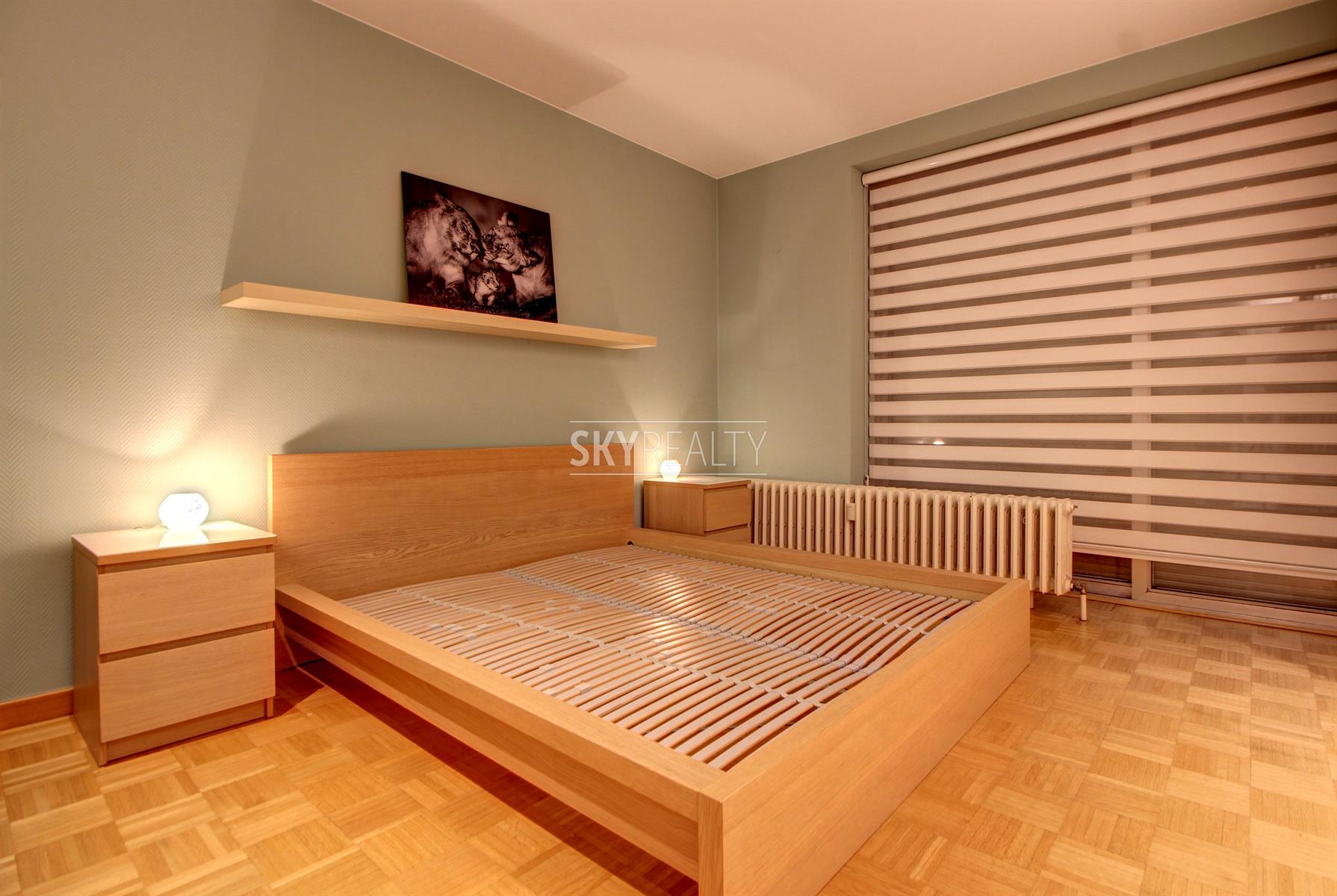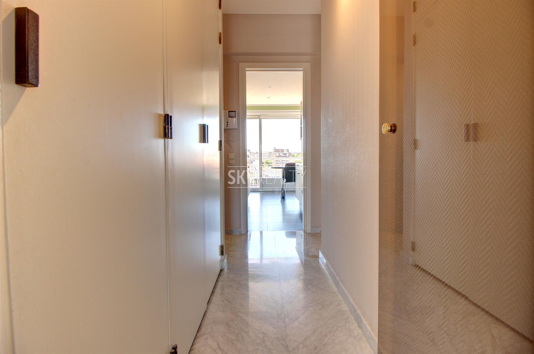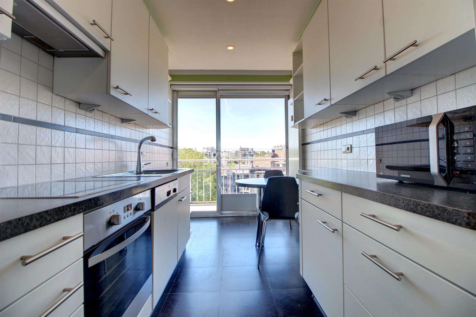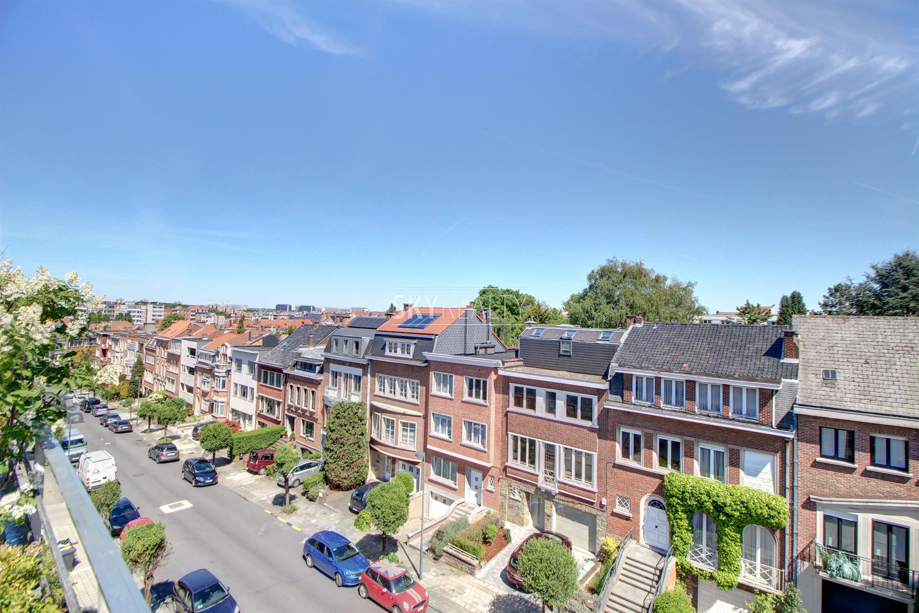 *** R E N T E D *** Gribaumont / Josephine Charlotte: Ideally located in a small condominium, in a quiet place but close to the metro and all facilities, this beautiful 2 bedroom penthouse of 90 sqm will seduce you with its nice amenities. It offers: an entrance hall with cloakroom, a guest toilet, a living room (parquet and open fire) opening onto a pleasant terrace with a nice view and equipped with an open fire (ideal for barbecues), a fully equipped kitchen (fridge, ceramic hob, extractor, oven, microwave, dishwasher), night hall, 2 large bedrooms, 1 bathroom (bath, washbasin, programmable towel radiator), an en-suite shower (shower, sink, toilet), laundry room (washing machine included), cellar, large garage box (automatic door with remote control) in the basement accessible by elevator. The bedrooms and the kitchen give access to the second terrace. Possibility to sublet the garage. Nice amenities: Alarm, 2 bathrooms, 2 toilets, 2 terraces, double glazing throughout, solid oak flooring (bedrooms and living room), carrara marble in the hall, solar tent and open fire on the terrace, etc. Only one apartment on the landing (privacy guaranteed). Apartment rented semi furnished (tables, chairs, furniture with integrated TV & home cinema, library, bed frames with box spring and large wardrobe in the master bedroom). Option 100% furnished possible. Rent 1350 € (garage included) + 120 € charges (provision for heating, water and common area maintenance fees).