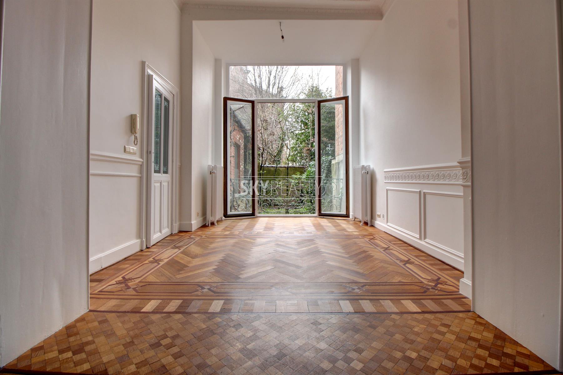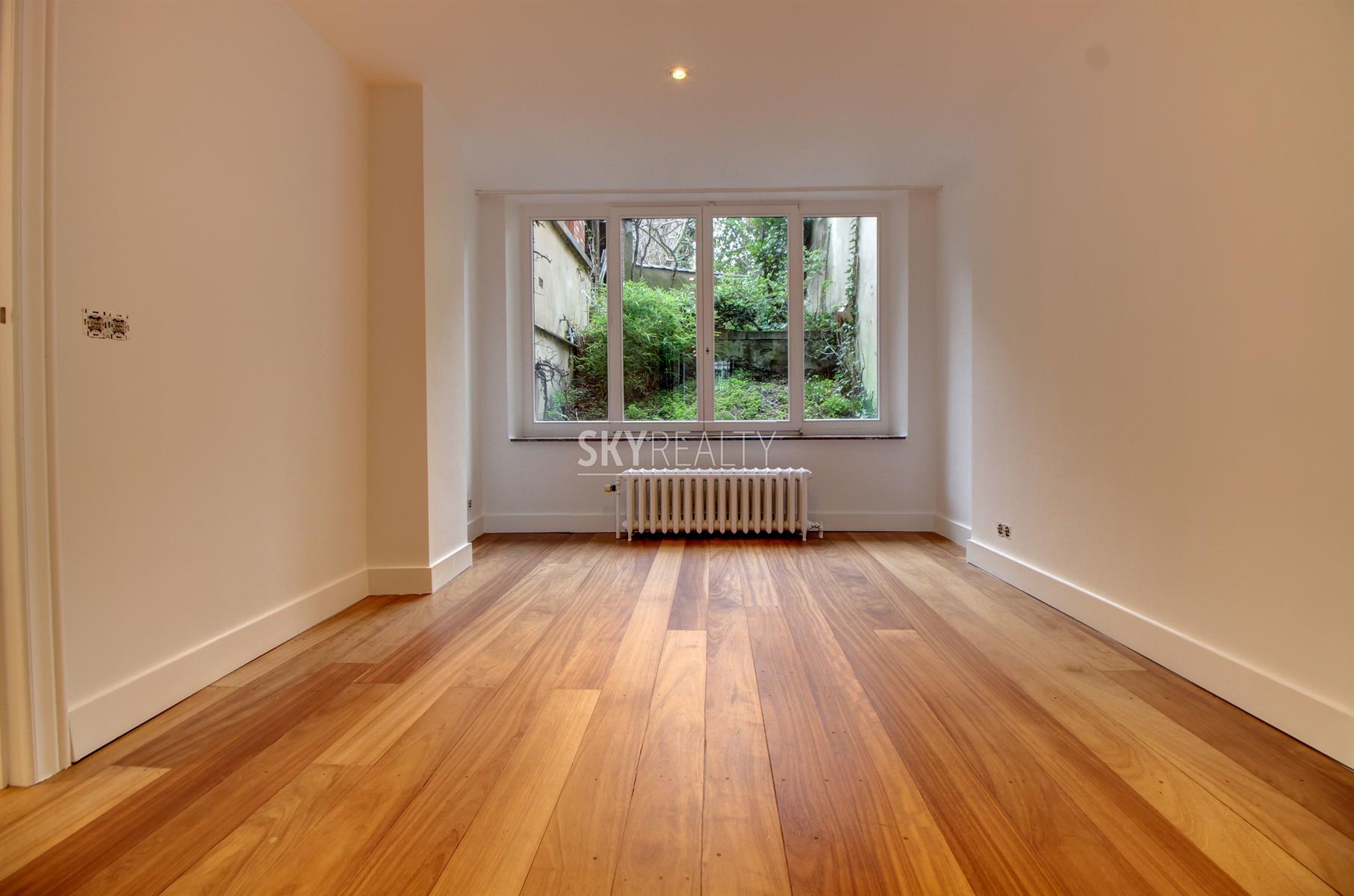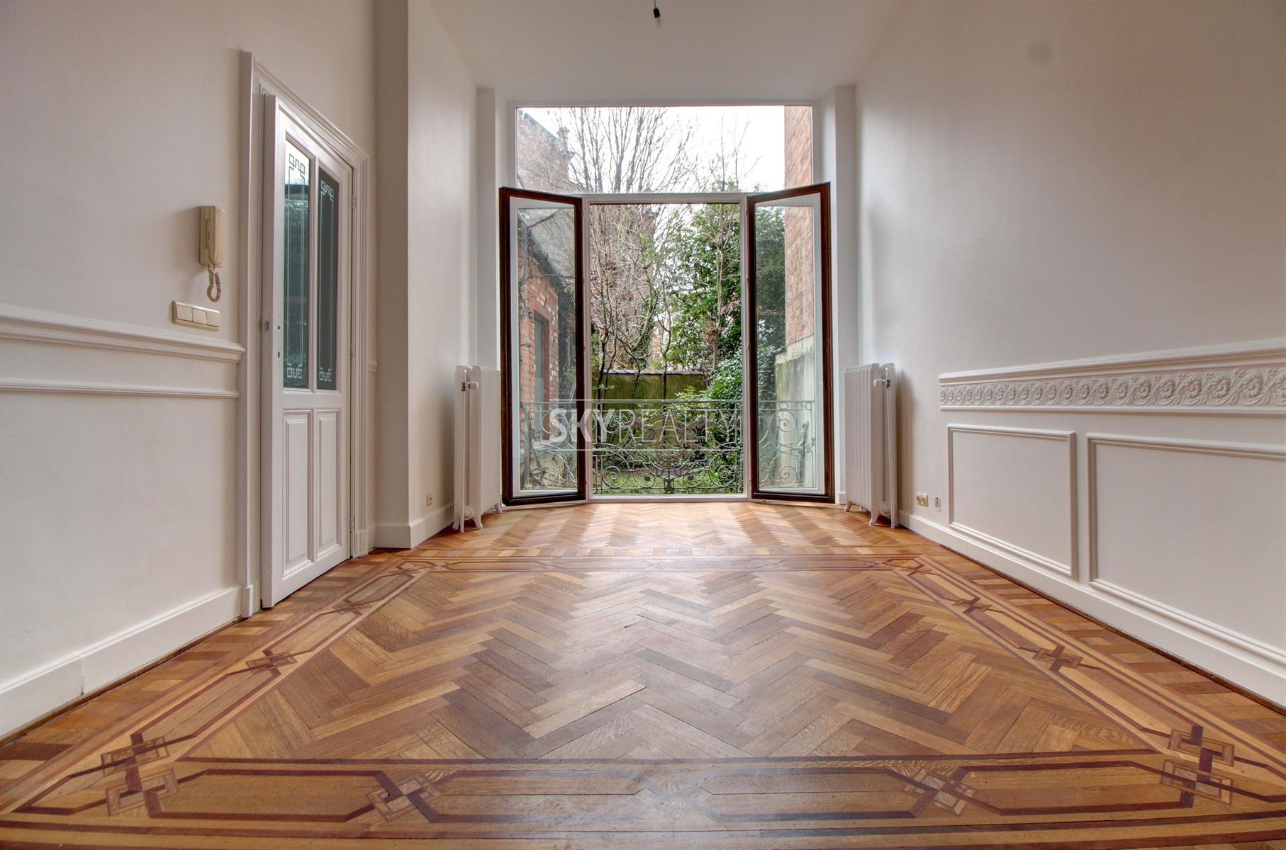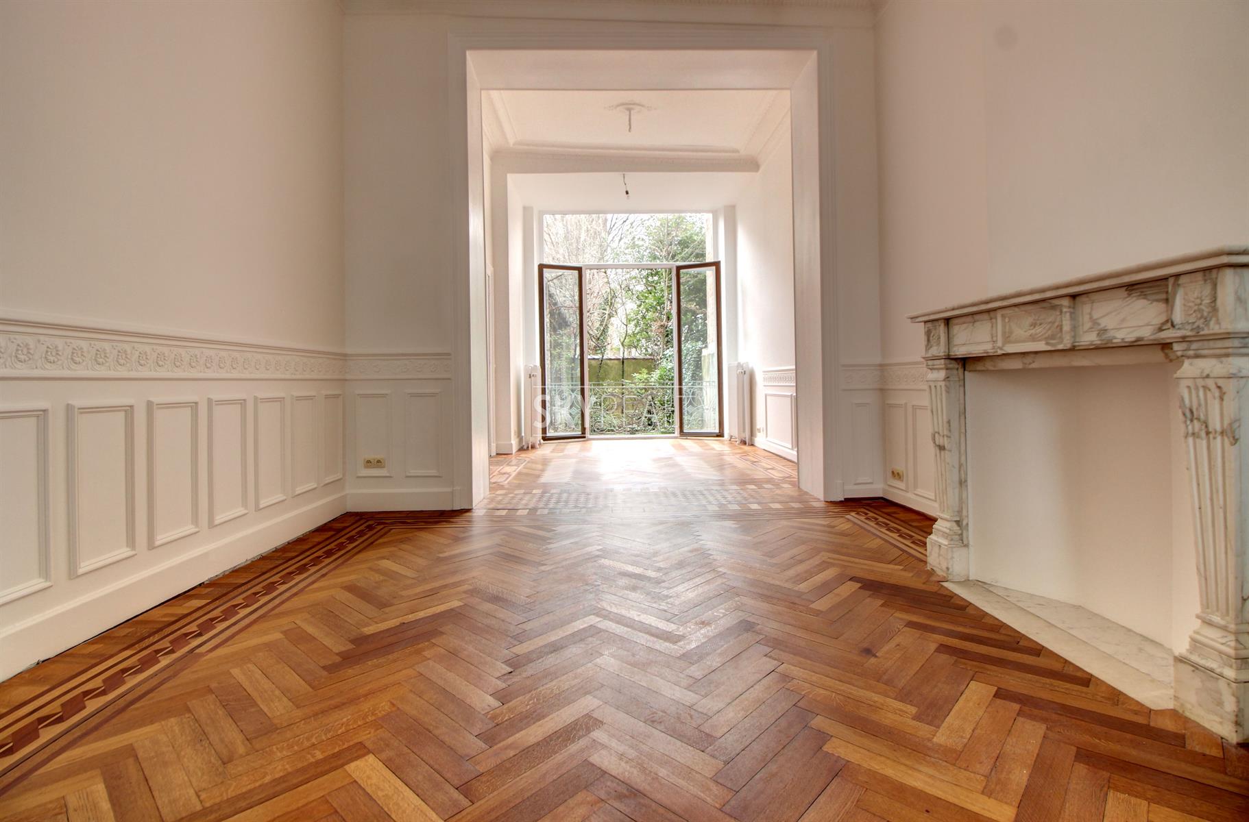 SCHUMAN / QUARTIER EUROPEEN / SQUARE AMBIORIX: Idéalement situé à proximité immédiate des transports en commun et de toutes les facilités, ce splendide duplex 2 chambres de 160 m² au rez-de-chaussée d'une belle maison de maître vous enchantera par ses beaux volumes, la qualité de sa rénovation, ses éléments d'époque parfaitement conservés et son agréable jardin exposé sud. Il se compose comme suit: au rez-de-chaussée: un hall d'entrée avec toilette invités, vestiaire et placards; un spacieux et lumineux séjour de 55 m² (3 pièces en enfilades avec beau parquet en chêne massif, hauts plafonds, moulures, cheminée en marbres, miroir), une grande cuisine design très haut de gamme (Bulthaup) et super équipée (réfrigérateur-surgélateur, taque vitrocéramique, hotte, four, lave-vaisselle, etc.), un agréable jardin exposé sud et une terrasse couverte. Au niveau inférieur: un hall de nuit, 2 grandes chambres (18 et 15 m²), une grande salle de bain de 16 m² (bain, douche, lavabo double, dressing), une toilette séparée, une buanderie équipée (machine à laver et séchoir inclus), de nombreux placards, une cave. Double vitrage chassis bois. Localisation prisée à 400m de Schuman à coté des transports (métro, bus, trains) et de tous les services (commerces, supermarchés, restaurants, etc.). Parc du Cinquantenaire à 3 min. à pied. Accès aisé aux grands axes autoroutiers. Loyer 1600€ + 250€ (provision pour chauffage, eau, entretien des communs et assurance). Infos & Visites: David: 0495 511 555
