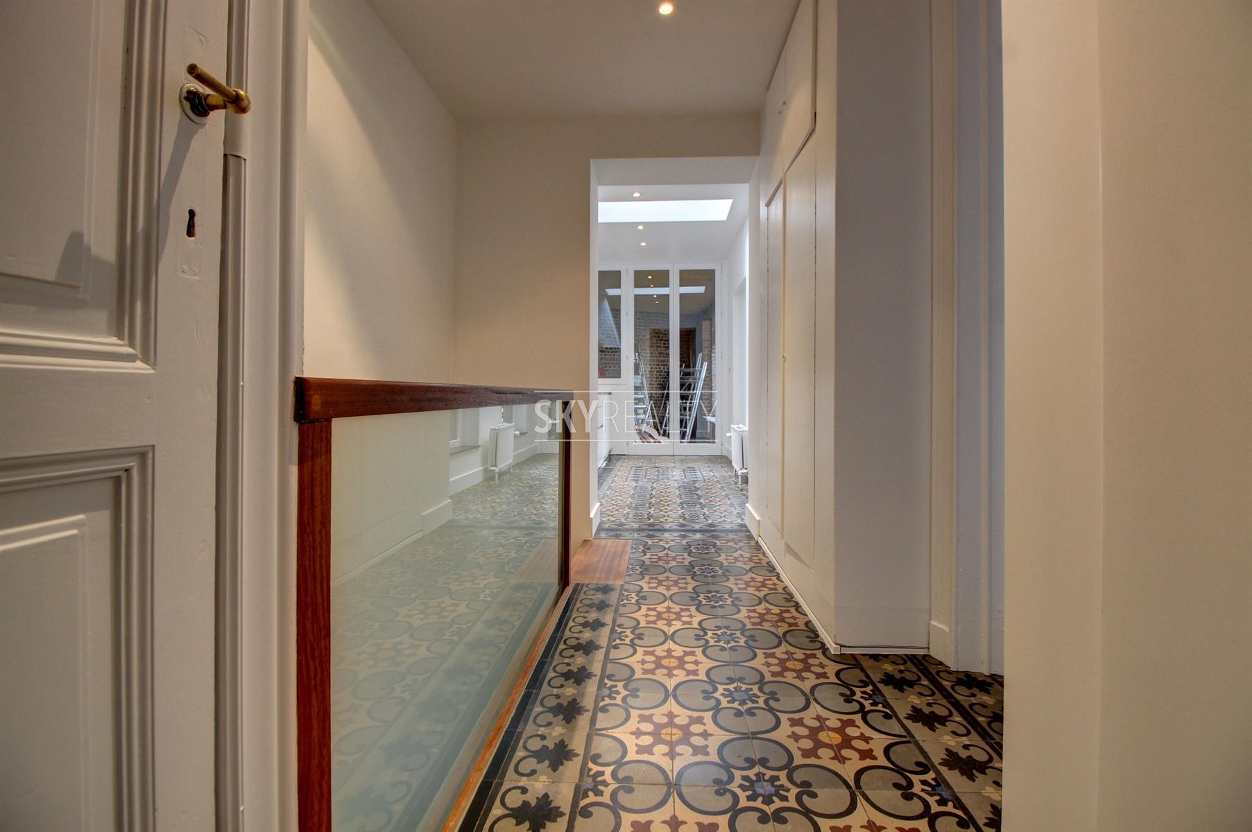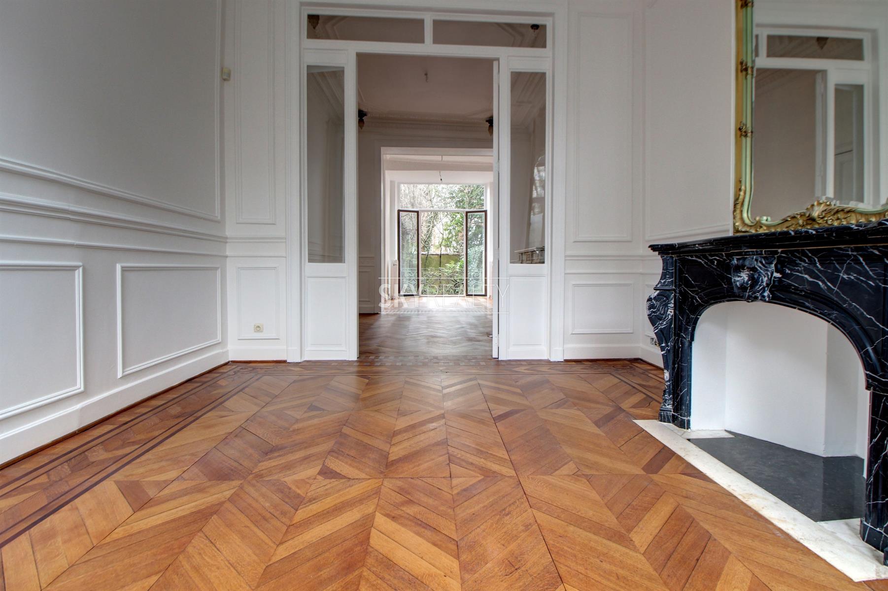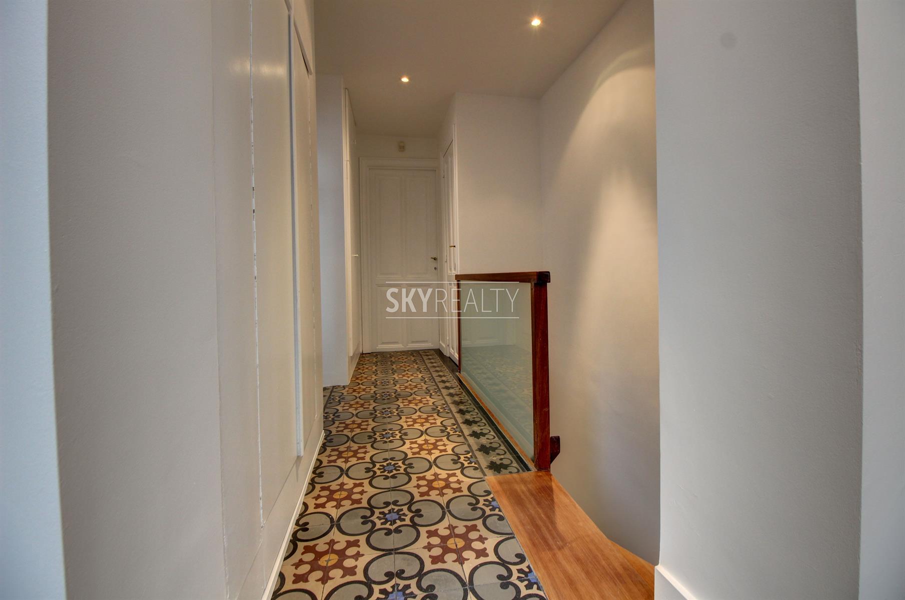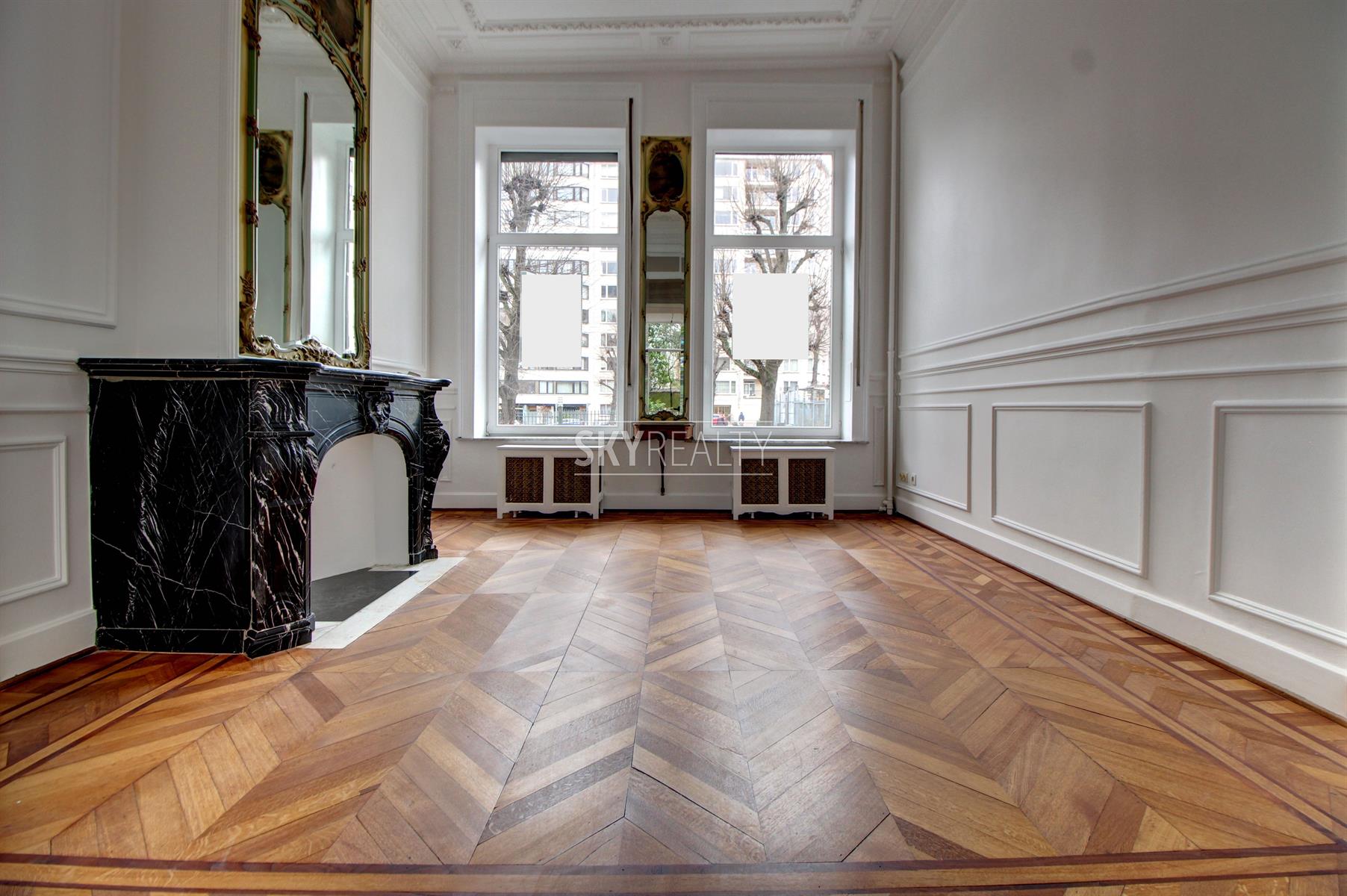 SCHUMAN / QUARTIER EUROPEEN / SQUARE AMBIORIX: Idéalement situé à proximité immédiate des transports en commun et de toutes les facilités, ce splendide duplex 2 chambres de 160 m² au rez-de-chaussée d'une belle maison de maître vous enchantera par ses beaux volumes, la qualité de sa rénovation, ses éléments d'époque parfaitement conservés et son agréable jardin exposé sud. Il se compose comme suit: au rez-de-chaussée: un hall d'entrée avec toilette invités, vestiaire et placards; un spacieux et lumineux séjour de 55 m² (3 pièces en enfilades avec beau parquet en chêne massif, hauts plafonds, moulures, cheminée en marbres, miroir), une grande cuisine design très haut de gamme (Bulthaup) et super équipée (réfrigérateur-surgélateur, taque vitrocéramique, hotte, four, lave-vaisselle, etc.), un agréable jardin exposé sud et une terrasse couverte. Au niveau inférieur: un hall de nuit, 2 grandes chambres (18 et 15 m²), une grande salle de bain de 16 m² (bain, douche, lavabo double, dressing), une toilette séparée, une buanderie équipée (machine à laver et séchoir inclus), de nombreux placards, une cave. Double vitrage chassis bois. Localisation prisée à 400m de Schuman à coté des transports (métro, bus, trains) et de tous les services (commerces, supermarchés, restaurants, etc.). Parc du Cinquantenaire à 3 min. à pied. Accès aisé aux grands axes autoroutiers. Loyer 1600€ + 250€ (provision pour chauffage, eau, entretien des communs et assurance). Infos & Visites: David: 0495 511 555