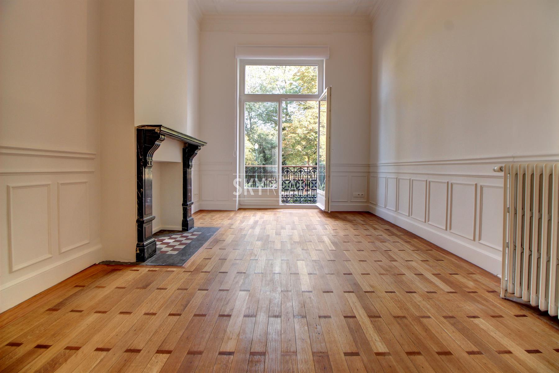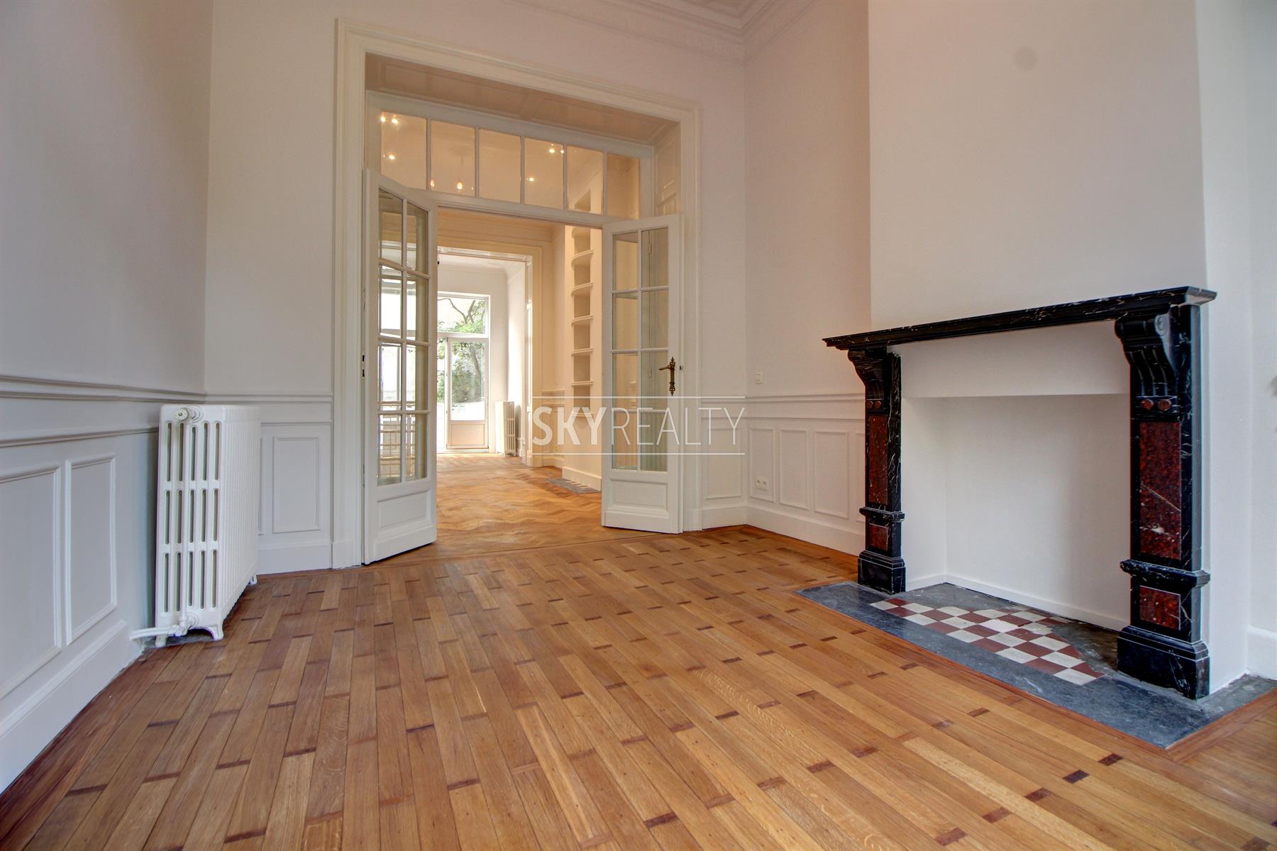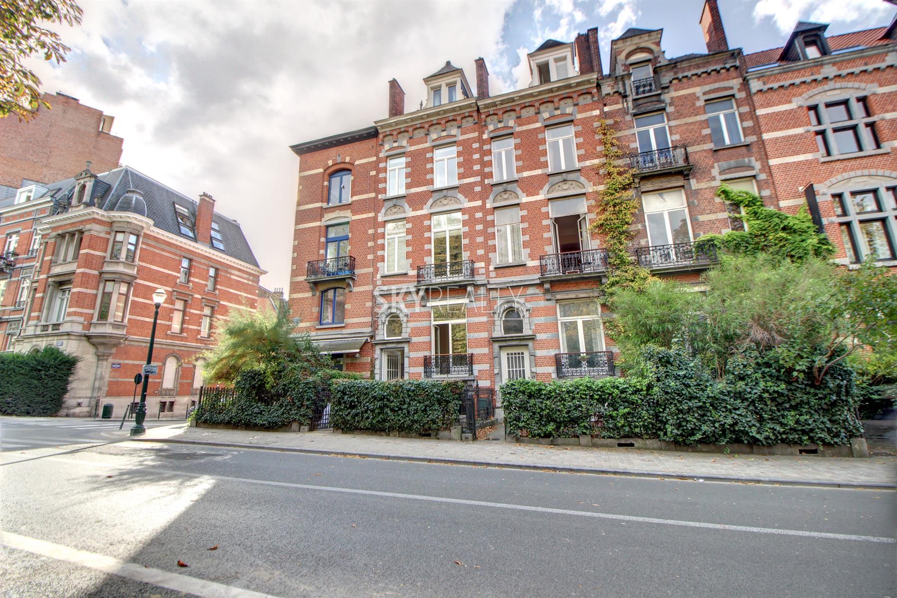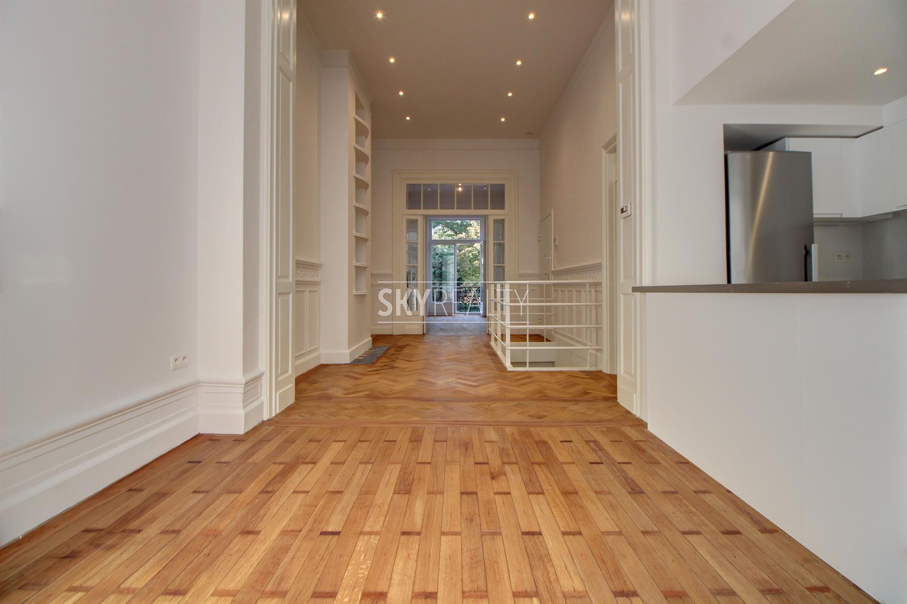 ** Loué ** SCHUMAN / QUARTIER EUROPEEN / SQUARE AMBIORIX: Idéalement situé sur le Square Ambiorix, à proximité immédiate des transports en commun et de toutes les facilités, ce splendide duplex 2 chambres de 131 m² au bel étage d'une jolie maison de maître vous enchantera par ses beaux volumes, la qualité de sa rénovation et sa son agréable jardin. Première occupation après rénovation complète. Il offre: accès via un jardinet privé, hall d'entrée, un living composé de 3 pièces en enfilade avec accès à l'agréable jardin à l'arrière (exposé ouest), une spacieuse cuisine américaine super équipée (réfrigérateur-congélateur, taque induction, hotte, four, lave-vaisselle, beaucoup de rangement) avec ilot central convivial, une toilette invité; étage inférieur: vaste hall de nuit, deux chambres (14 et 12m²), deux salles de bain en-suite (1 avec toilette + bain/douche, lavabo double vasque, radiateur porte-serviette), 1 toilette séparée, buanderie, placards. Triple & double vitrage, hauts plafonds, moulures, boiserie, parquets en marqueterie d'origine, cheminée en marbre, puits de lumière naturelle, porte blindée, thermostat d'ambiance, visiophone, etc. Localisation prisée à 300m de Schuman à coté des transports (métro, bus, trains) et de tous les services (commerces, supermarchés, restaurants, etc.). Parc du Cinquantenaire à 3 min. à pied. Accès aisé aux grands axes autoroutiers. Loyer 1900€ + 50€ (forfait pour les communs). Libre immédiatement. Infos & visites: David: 0495 511 555.