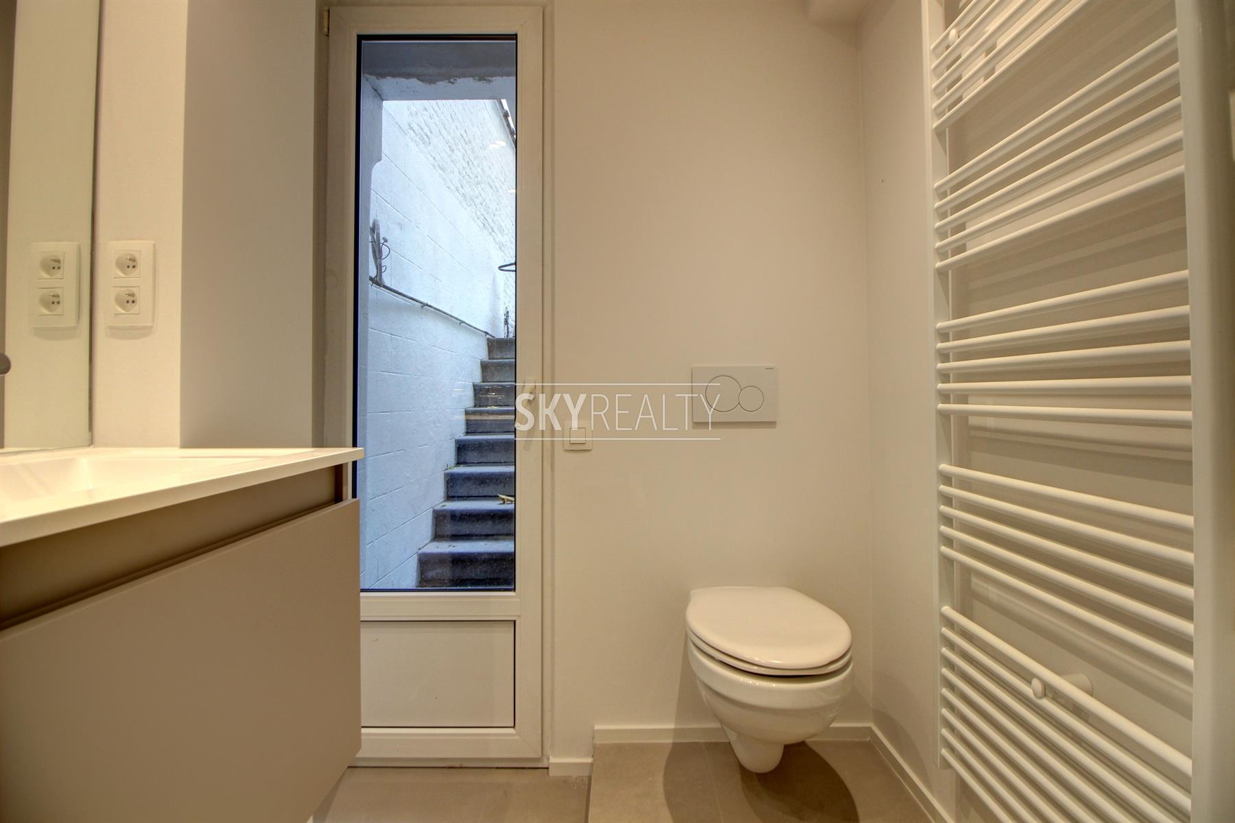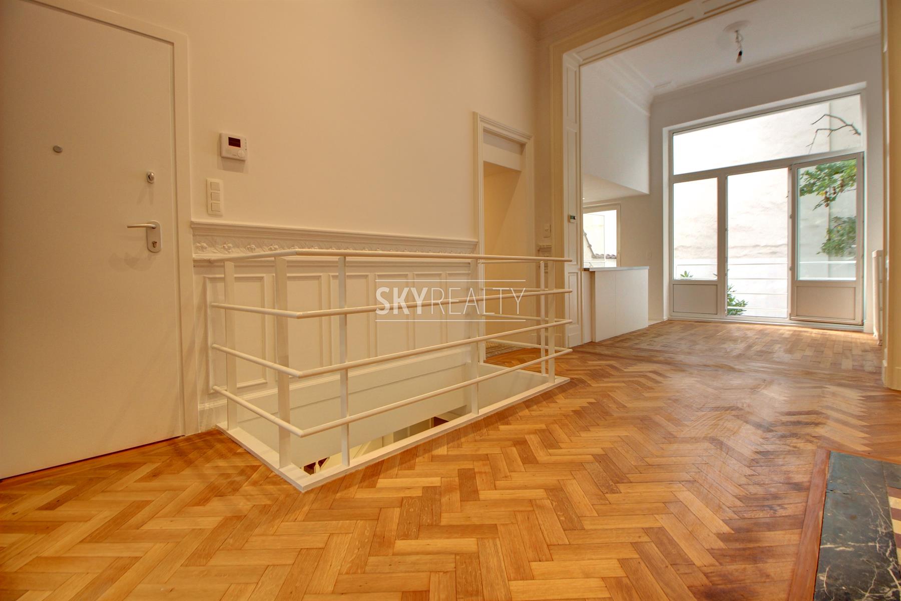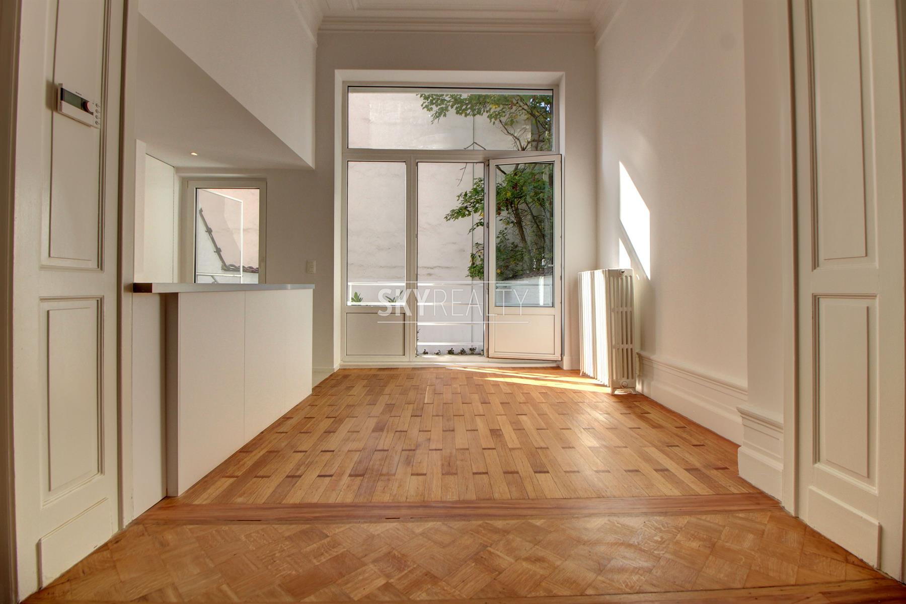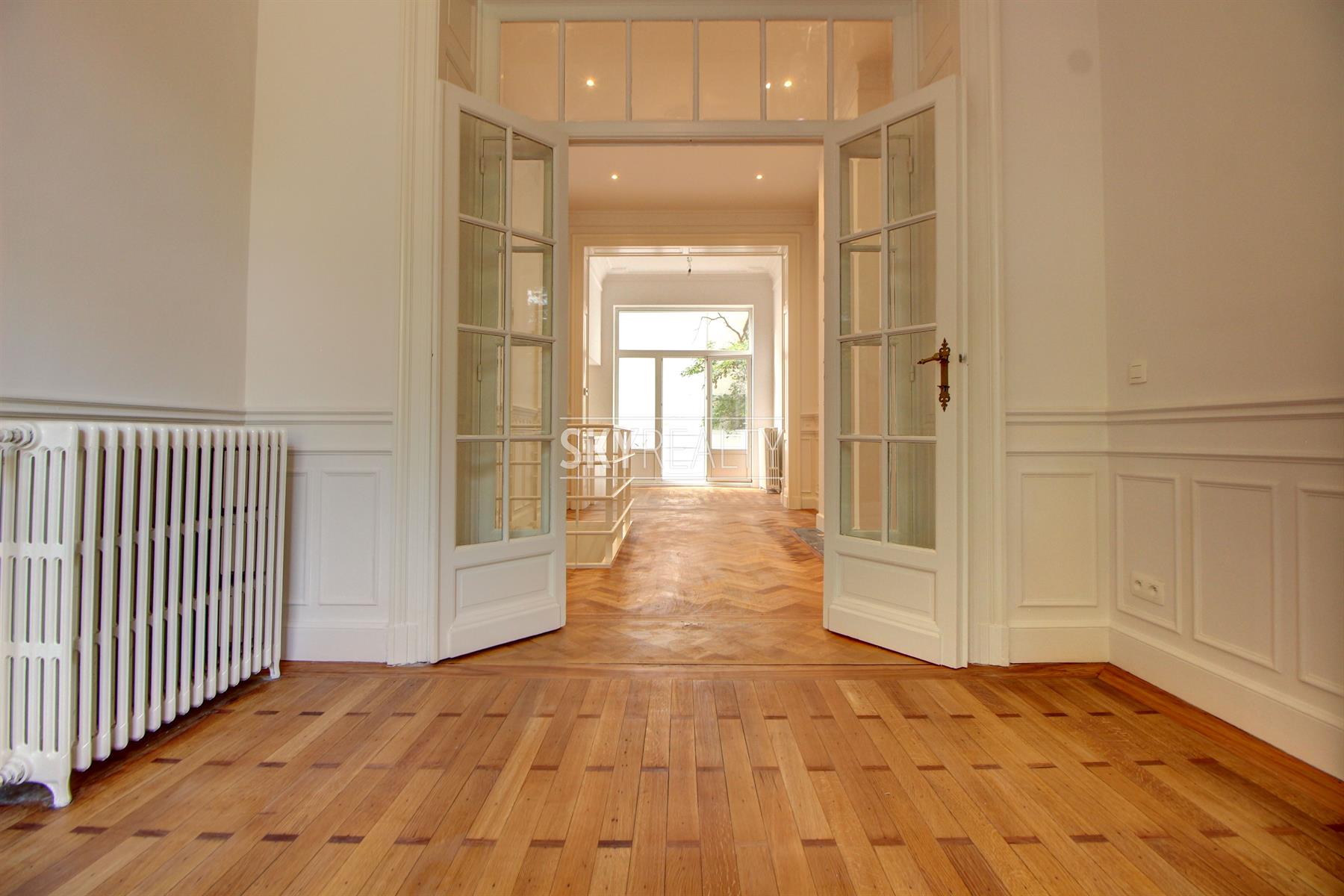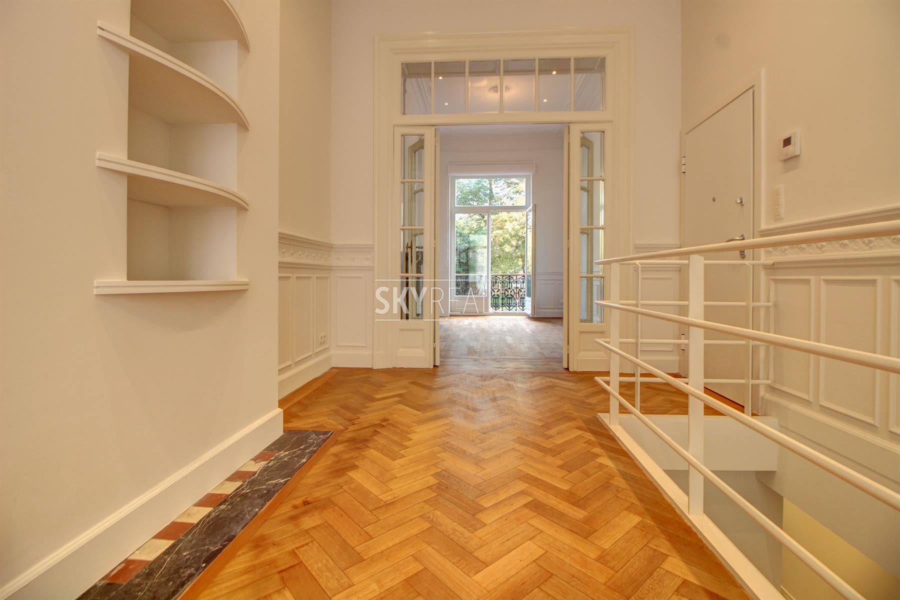 ** Loué ** SCHUMAN / QUARTIER EUROPEEN / SQUARE AMBIORIX: Idéalement situé sur le Square Ambiorix, à proximité immédiate des transports en commun et de toutes les facilités, ce splendide duplex 2 chambres de 131 m² au bel étage d'une jolie maison de maître vous enchantera par ses beaux volumes, la qualité de sa rénovation et sa son agréable jardin. Première occupation après rénovation complète. Il offre: accès via un jardinet privé, hall d'entrée, un living composé de 3 pièces en enfilade avec accès à l'agréable jardin à l'arrière (exposé ouest), une spacieuse cuisine américaine super équipée (réfrigérateur-congélateur, taque induction, hotte, four, lave-vaisselle, beaucoup de rangement) avec ilot central convivial, une toilette invité; étage inférieur: vaste hall de nuit, deux chambres (14 et 12m²), deux salles de bain en-suite (1 avec toilette + bain/douche, lavabo double vasque, radiateur porte-serviette), 1 toilette séparée, buanderie, placards. Triple & double vitrage, hauts plafonds, moulures, boiserie, parquets en marqueterie d'origine, cheminée en marbre, puits de lumière naturelle, porte blindée, thermostat d'ambiance, visiophone, etc. Localisation prisée à 300m de Schuman à coté des transports (métro, bus, trains) et de tous les services (commerces, supermarchés, restaurants, etc.). Parc du Cinquantenaire à 3 min. à pied. Accès aisé aux grands axes autoroutiers. Loyer 1900€ + 50€ (forfait pour les communs). Libre immédiatement. Infos & visites: David: 0495 511 555.