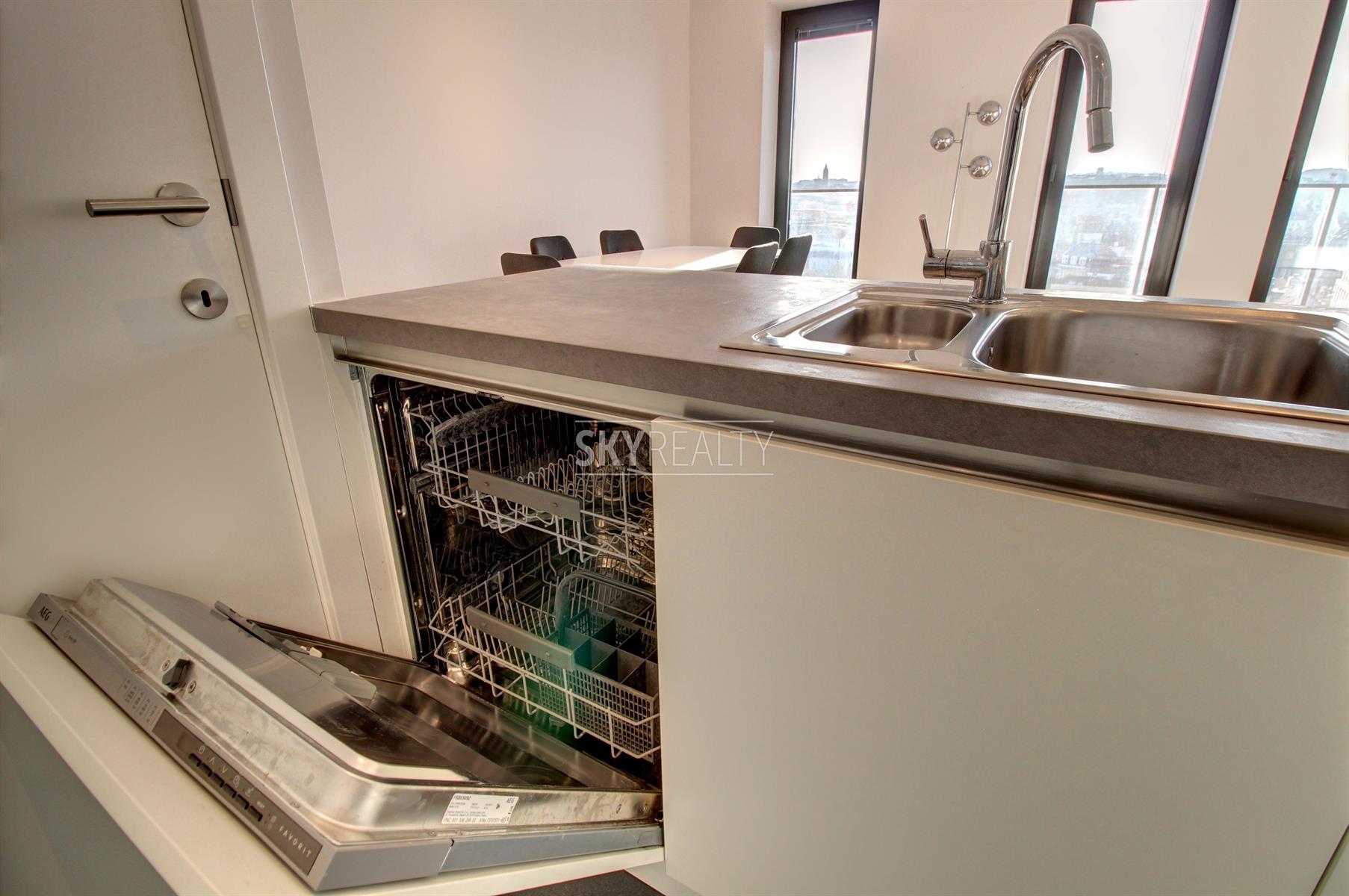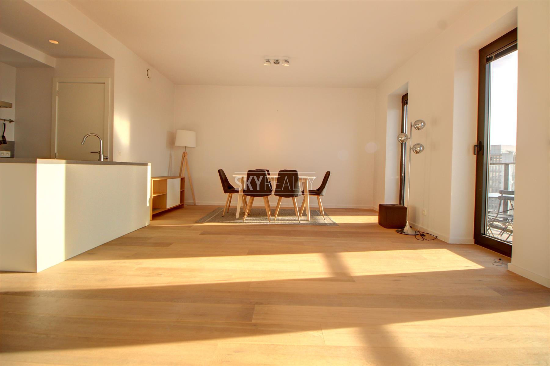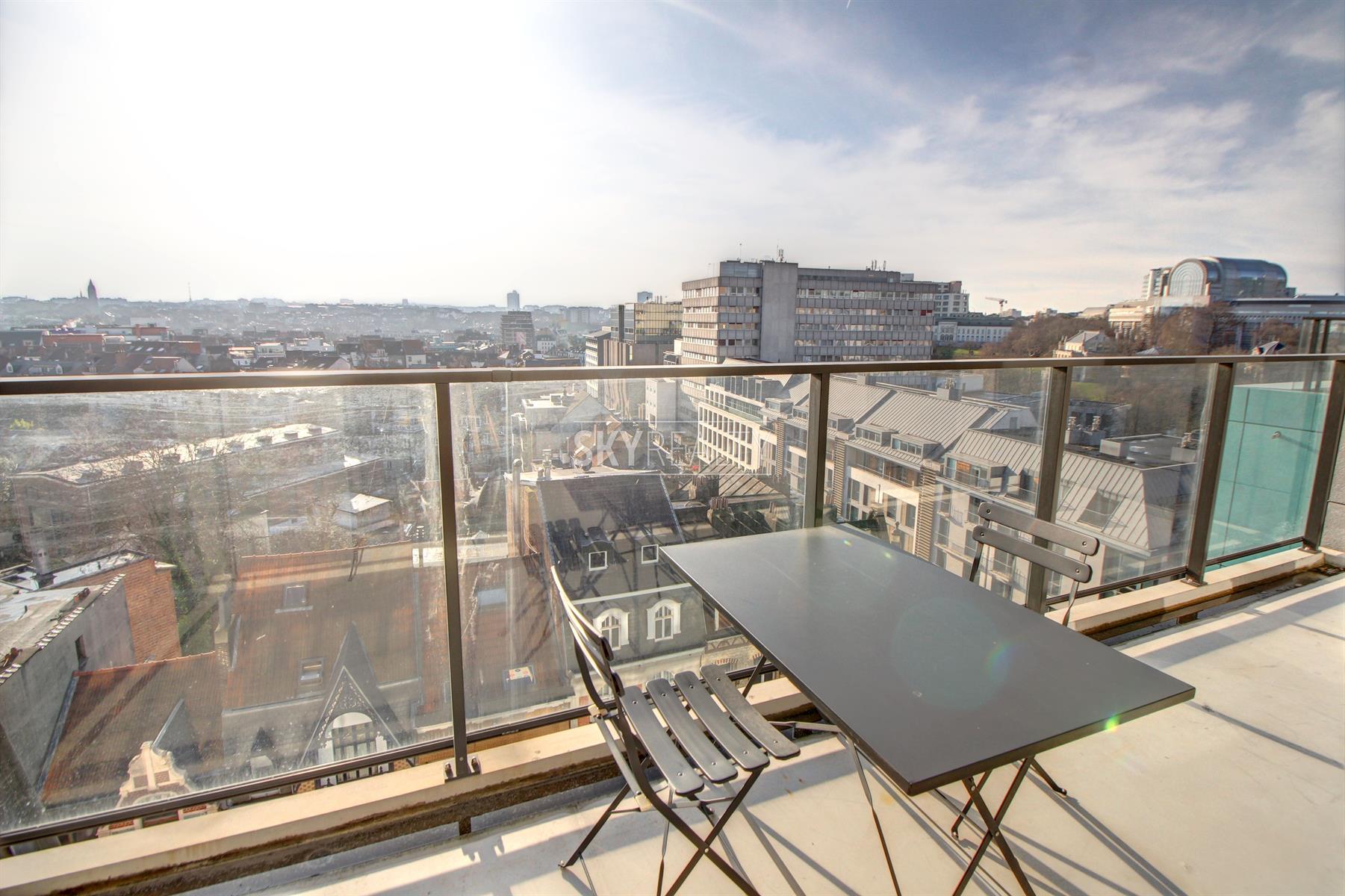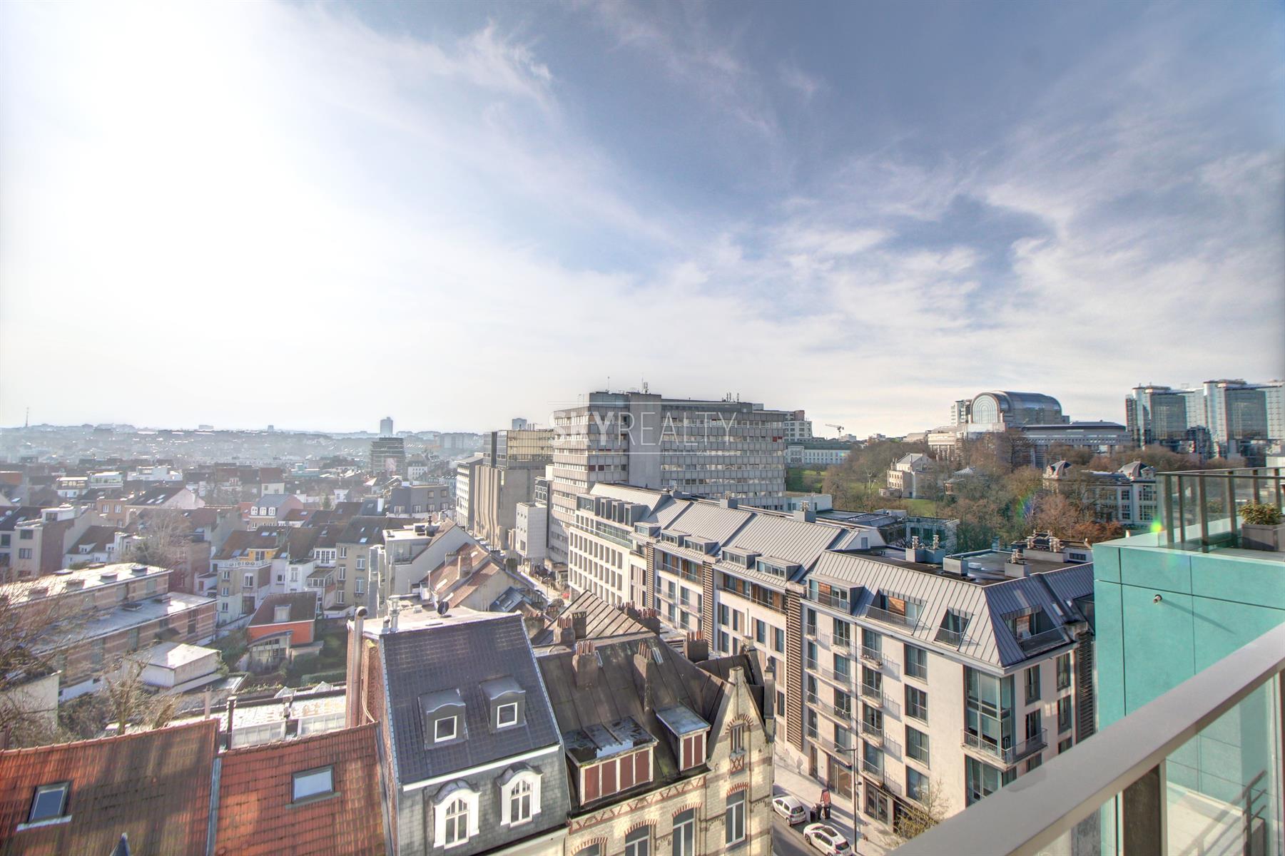 SCHUMAN / QUARTIER EUROPEEN / LEOPOLD / JOURDAN: Ce splendide penthouse 1 chambre de 85 m² entièrement meublé au 8e étage d'une nouveau projet vous séduira par son living et sa terrasse exposés plein sud (magnifique vue sans aucun vis-à-vis), ses belles prestations et sa localisation parfaite à 200m du Rond-point Schuman, de la Place Jourdan, à coté des transports, des parcs et de toutes les facilités. Il offre: un spacieux hall entrée avec vestiaire et de grands placards sur mesure, une toilette invité, un beau séjour de 41 m², une cuisine ouverte super équipée (réfrigérateur, taque vitrocéramique, hotte, combo four-micro-ondes, lave-vaisselle), une buanderie (combo lavante-séchante incluse), une grande chambre de 20 m² à l'arrière (en intérieur d'ilot) avec son dressing sur mesure et sa salle de bain en suite de (lavabo double-vasque, douche, toilette, radiateur porte-serviette), une cave, un emplacement de parking (option). Porte blindée, parquet en chêne, spots design, chauffage sol, système double-flux, faibles charges énergétiques PEB B-. Son étage élevé (8e) et son exposition plein sud (terrasse, living, cuisine) vous garantiront une luminosité exceptionnelle et une vue imprenable sur Bruxelles. Un bien entièrement meublé avec vaisselle et ustensiles de cuisine, lit, édredon, etc. N.B.: un canapé sera installé (non présent sur les photos). À coté des commerces. Loyer: 1650€ + 120€ de charges. Emplacement de parking (option +150€). Infos et visites: David: 0495 511 555