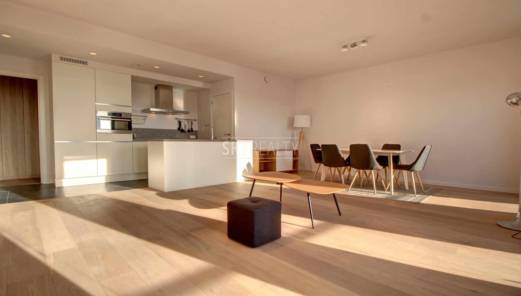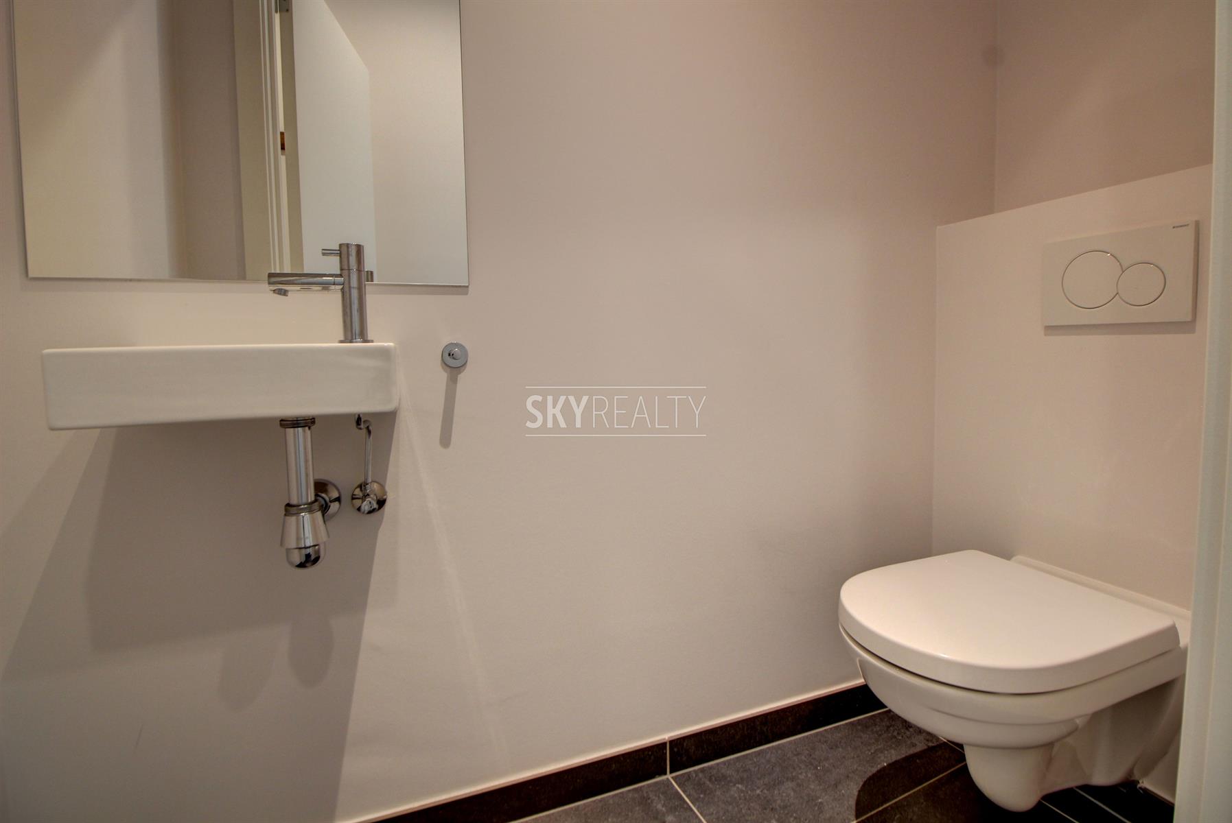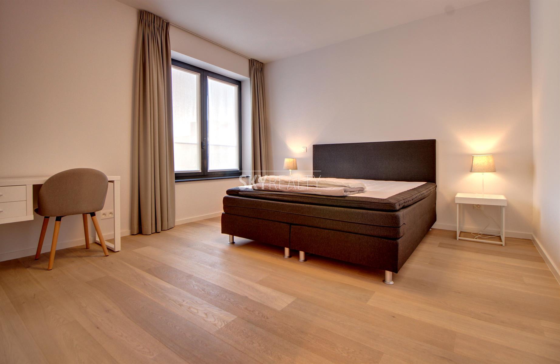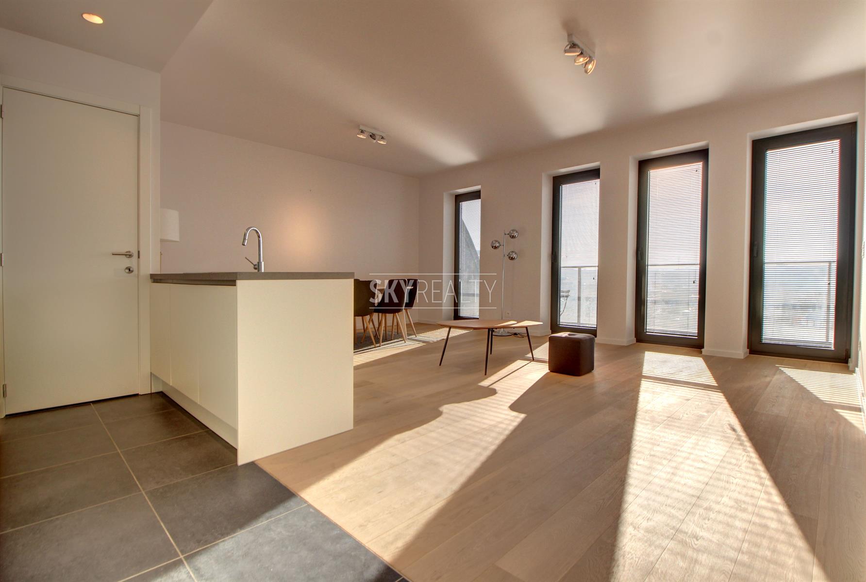 SCHUMAN / QUARTIER EUROPEEN / LEOPOLD / JOURDAN: Ce splendide penthouse 1 chambre de 85 m² entièrement meublé au 8e étage d'une nouveau projet vous séduira par son living et sa terrasse exposés plein sud (magnifique vue sans aucun vis-à-vis), ses belles prestations et sa localisation parfaite à 200m du Rond-point Schuman, de la Place Jourdan, à coté des transports, des parcs et de toutes les facilités. Il offre: un spacieux hall entrée avec vestiaire et de grands placards sur mesure, une toilette invité, un beau séjour de 41 m², une cuisine ouverte super équipée (réfrigérateur, taque vitrocéramique, hotte, combo four-micro-ondes, lave-vaisselle), une buanderie (combo lavante-séchante incluse), une grande chambre de 20 m² à l'arrière (en intérieur d'ilot) avec son dressing sur mesure et sa salle de bain en suite de (lavabo double-vasque, douche, toilette, radiateur porte-serviette), une cave, un emplacement de parking (option). Porte blindée, parquet en chêne, spots design, chauffage sol, système double-flux, faibles charges énergétiques PEB B-. Son étage élevé (8e) et son exposition plein sud (terrasse, living, cuisine) vous garantiront une luminosité exceptionnelle et une vue imprenable sur Bruxelles. Un bien entièrement meublé avec vaisselle et ustensiles de cuisine, lit, édredon, etc. N.B.: un canapé sera installé (non présent sur les photos). À coté des commerces. Loyer: 1650€ + 120€ de charges. Emplacement de parking (option +150€). Infos et visites: David: 0495 511 555