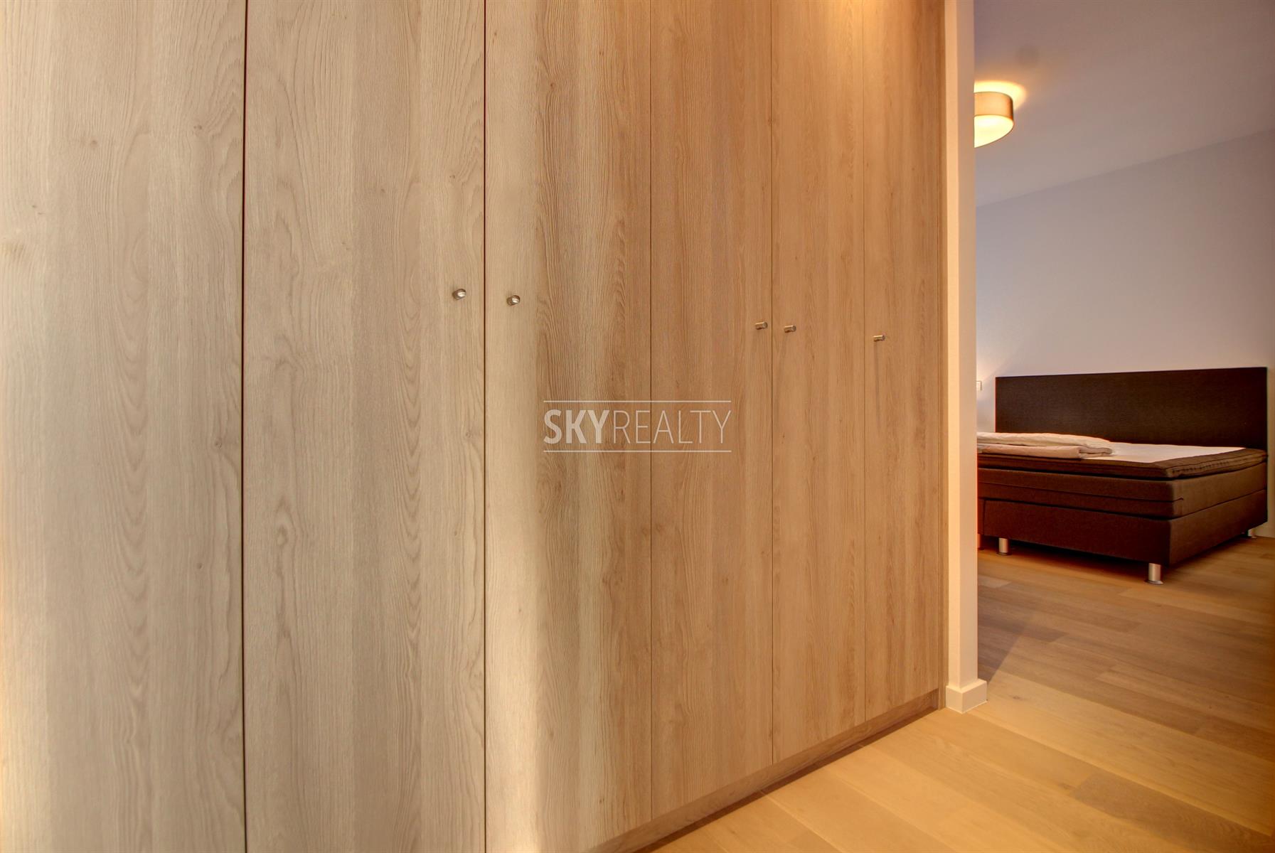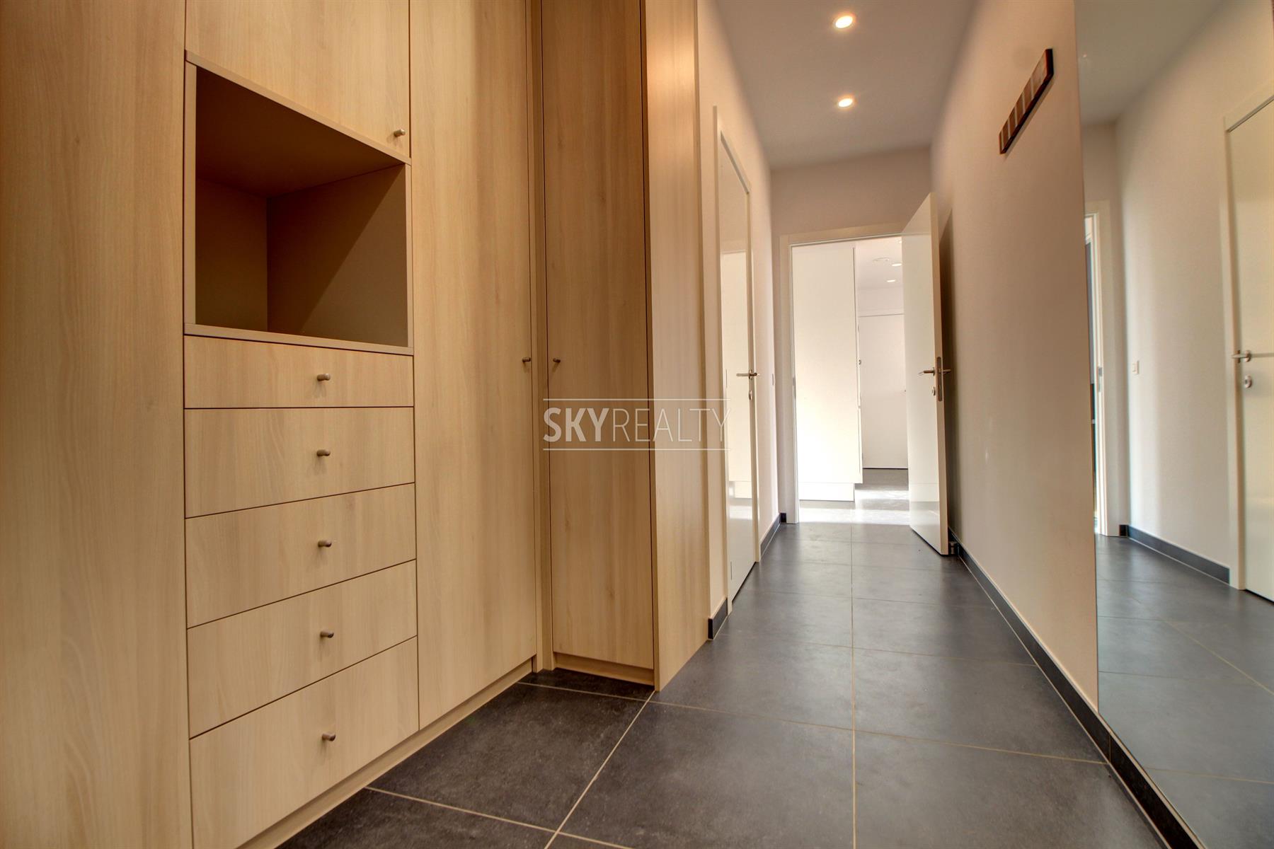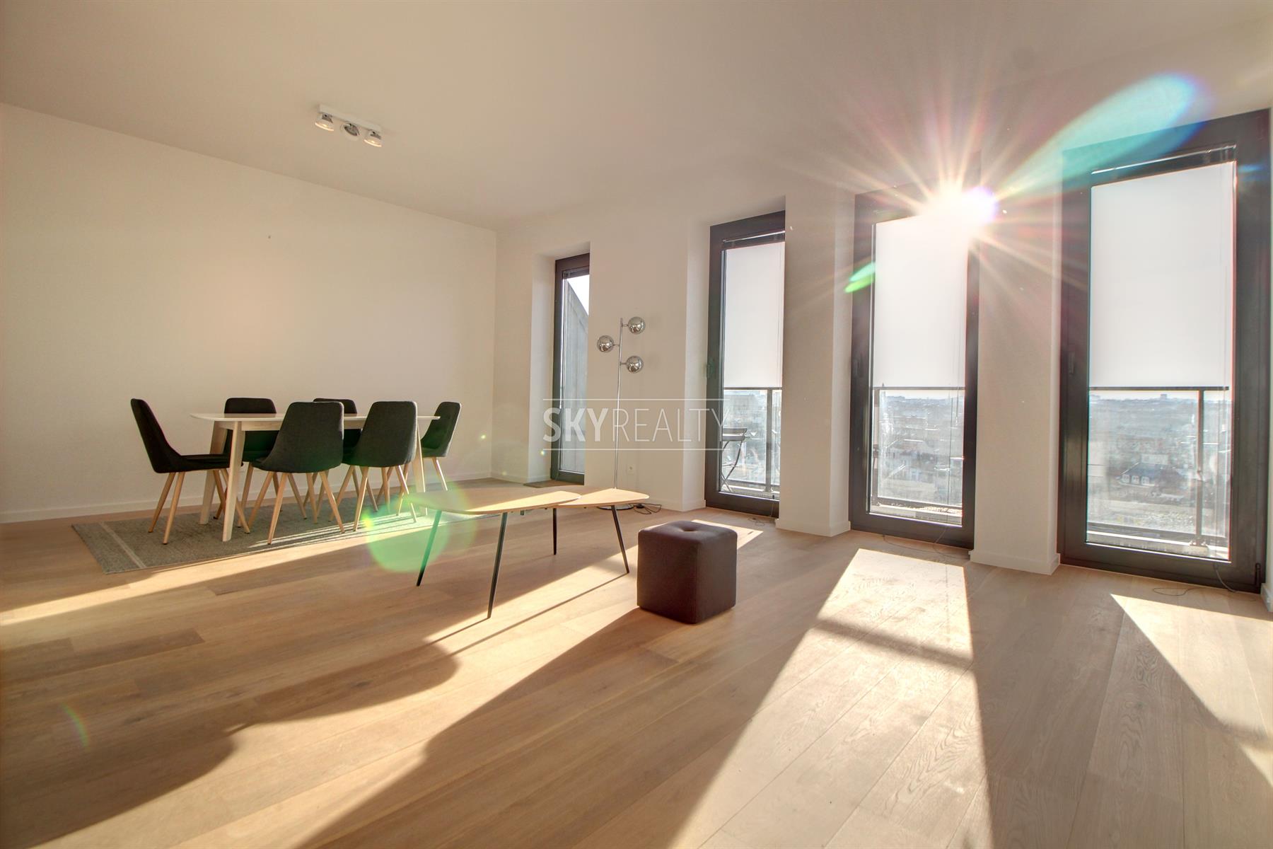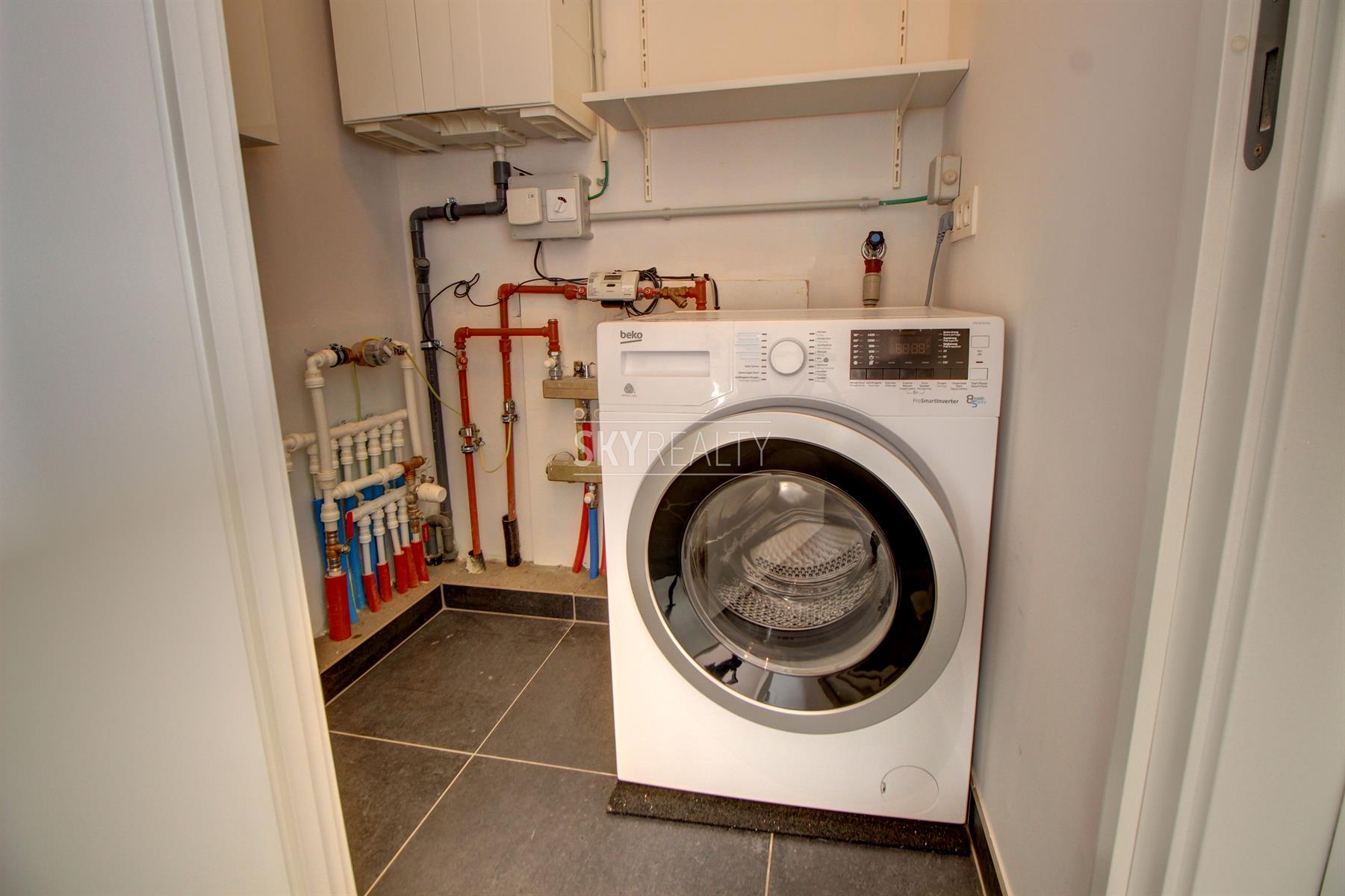 SCHUMAN / QUARTIER EUROPEEN / LEOPOLD / JOURDAN: Ce splendide penthouse 1 chambre de 85 m² entièrement meublé au 8e étage d'une nouveau projet vous séduira par son living et sa terrasse exposés plein sud (magnifique vue sans aucun vis-à-vis), ses belles prestations et sa localisation parfaite à 200m du Rond-point Schuman, de la Place Jourdan, à coté des transports, des parcs et de toutes les facilités. Il offre: un spacieux hall entrée avec vestiaire et de grands placards sur mesure, une toilette invité, un beau séjour de 41 m², une cuisine ouverte super équipée (réfrigérateur, taque vitrocéramique, hotte, combo four-micro-ondes, lave-vaisselle), une buanderie (combo lavante-séchante incluse), une grande chambre de 20 m² à l'arrière (en intérieur d'ilot) avec son dressing sur mesure et sa salle de bain en suite de (lavabo double-vasque, douche, toilette, radiateur porte-serviette), une cave, un emplacement de parking (option). Porte blindée, parquet en chêne, spots design, chauffage sol, système double-flux, faibles charges énergétiques PEB B-. Son étage élevé (8e) et son exposition plein sud (terrasse, living, cuisine) vous garantiront une luminosité exceptionnelle et une vue imprenable sur Bruxelles. Un bien entièrement meublé avec vaisselle et ustensiles de cuisine, lit, édredon, etc. N.B.: un canapé sera installé (non présent sur les photos). À coté des commerces. Loyer: 1650€ + 120€ de charges. Emplacement de parking (option +150€). Infos et visites: David: 0495 511 555