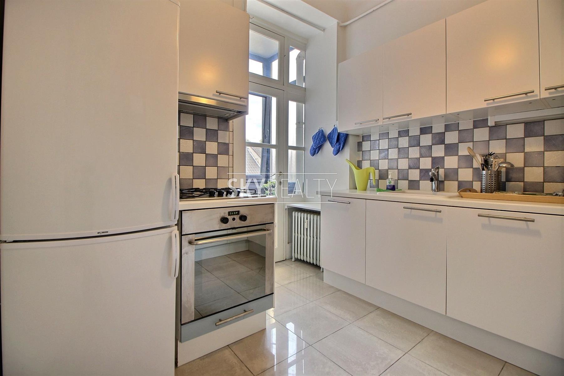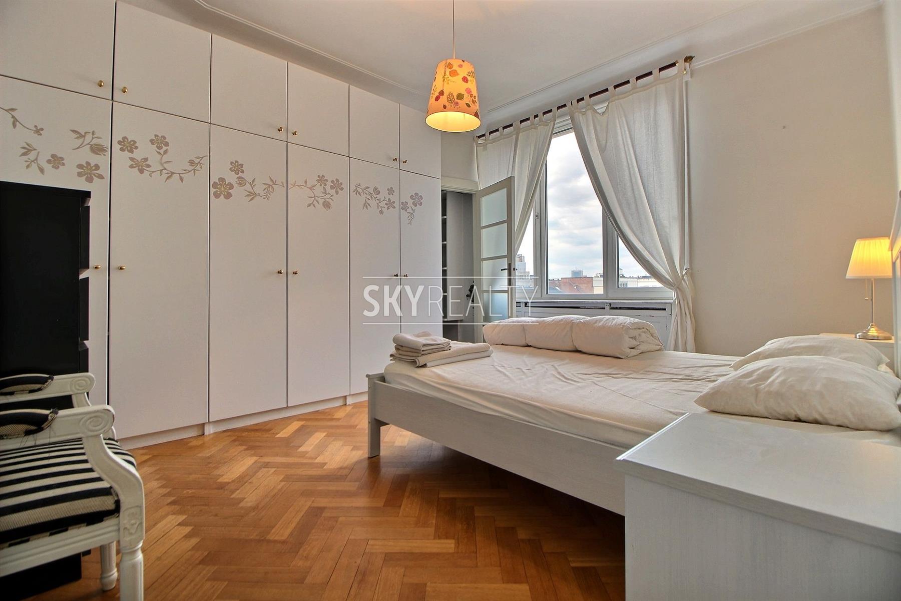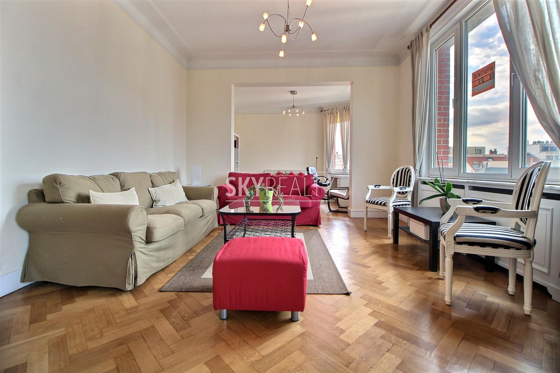AVENUE LOUISE / STEPHANIE: Idéalement situé dans un quartier recherché, ce bel appartement 2 chambres entièrement meublé de ± 110m² au cinquième étage d’un immeuble Art Deco de 1933 vous enchantera pour son caractère, ses beaux volumes et sa luminosité. Il se compose comme suit: un vaste hall d'entrée, un spacieux living lumineux offrant 3 pièces en enfilades (salle à manger, partie bureau ou salle de lecture...) bénéficiant de grandes baies vitrées sur tout la longueur (exposition ouest), une grande cuisine super équipée (taque au gaz, hotte, frigo, four, lave-vaisselle), balcon fermé avec espace buanderie équipée (machine à laver + séchoir inclus), une grande chambre (14m² + dressing séparé), une deuxième chambre de 12m², deux salles de douches (avec lavabo et toilette), débarras et une cave. Beau parquet d'époque, belle hauteur sous plafond et double vitrage dans tout l’appartement. Un bien lumineux, calme et agréable à vivre jouissant d'une localisation parfaite à proximité des transports (métro, tram, bus), de toutes les facilités et à seulement quelques minutes à pied de la Place du Chatelain, des étangs d'Ixelles, Flagey, du Shopping Louise / Toison d’Or / BD de Waterloo, etc. Bail minimum 1an. Libre 1 septembre 2021. Colocation acceptée. Loyer 1200€ + 300€ (provision pour l'eau chaude/froide, chauffage, entretien des parties communes). Infos et visites: David: +32 495 511 555