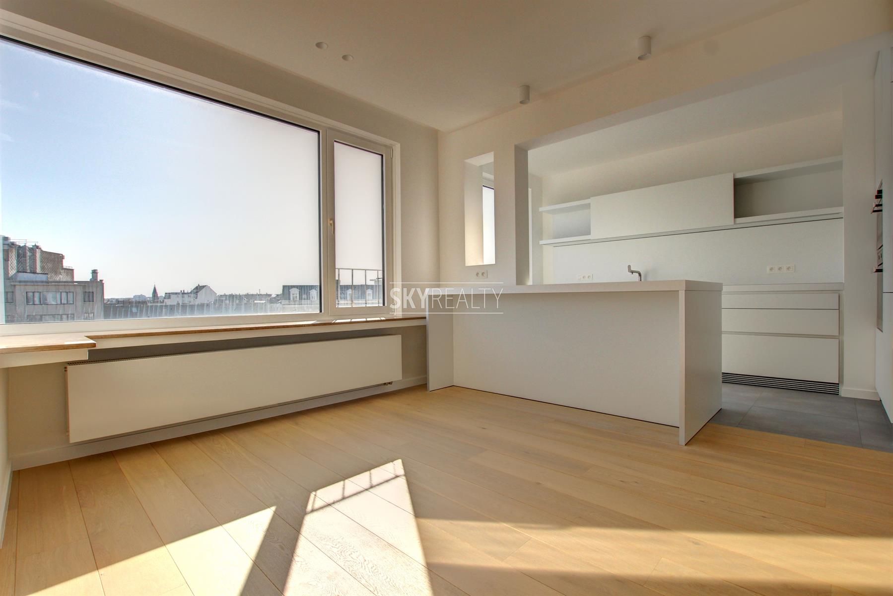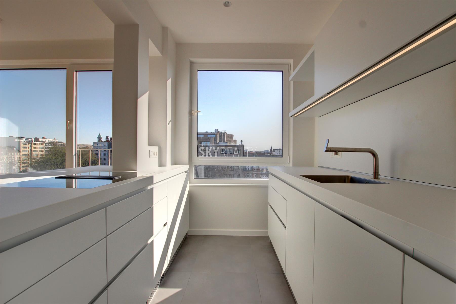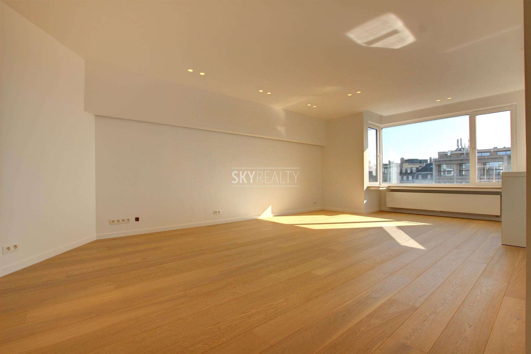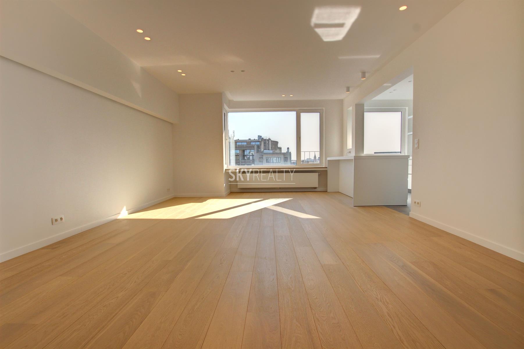 MONTGOMERY / AVEVUE DE TERVUREN: Ce splendide appartement de 95 m² au 6e étage sur 7 d'un immeuble de standing vous séduira par sa rénovation complète d'exception, sa localisation parfaite à coté de toutes les facilités, son exposition plein sud et ses jolies vues.. Il offre: un hall d'entrée avec vestiaire et rangement, un agréable living exposé plein sud, une cuisine américaine très haut de gamme (Bulthaup) et super équipée (électroménager 100% Miele: réfrigérateur-surgélateur, taque à induction avec hotte intégrée, four, micron-ondes, lave-vaisselle), un hall de nuit, deux chambres (16m² + 10m² + terrasse), une magnifique salle de bain (grande douche italienne de 90 cm x 200 cm), une toilette séparée, placards éclairés, une buanderie équipée avec machine à laver & séchoir (Miele), 1 cave. Jolie vue sur l'Avenue de Tervuren & le R.P. Montgomery. Beau parquet en chêne naturel, double vitrage, porte blindée, nouveaux radiateurs, volets électriques programmables (avec télécommandes) dans les 2 chambres + domotique: tous les luminaires (Delta Light) sont dimmables (système professionnel Dali) et actionnables/programmables avec tous les assistants vocaux (Amazon Alexa, Google Home, Apple HomePod) ou via les smartphones et tablettes. Première occupation après rénovation complète avec un architecte d'intérieur. À 20m du métro, des bus, trams & supermarché. Accès aisé aux autoroutes. Loyer + Charges: 200€ (provision pour eau, chauffage, communs). PEB: D-. Option meublé possible.