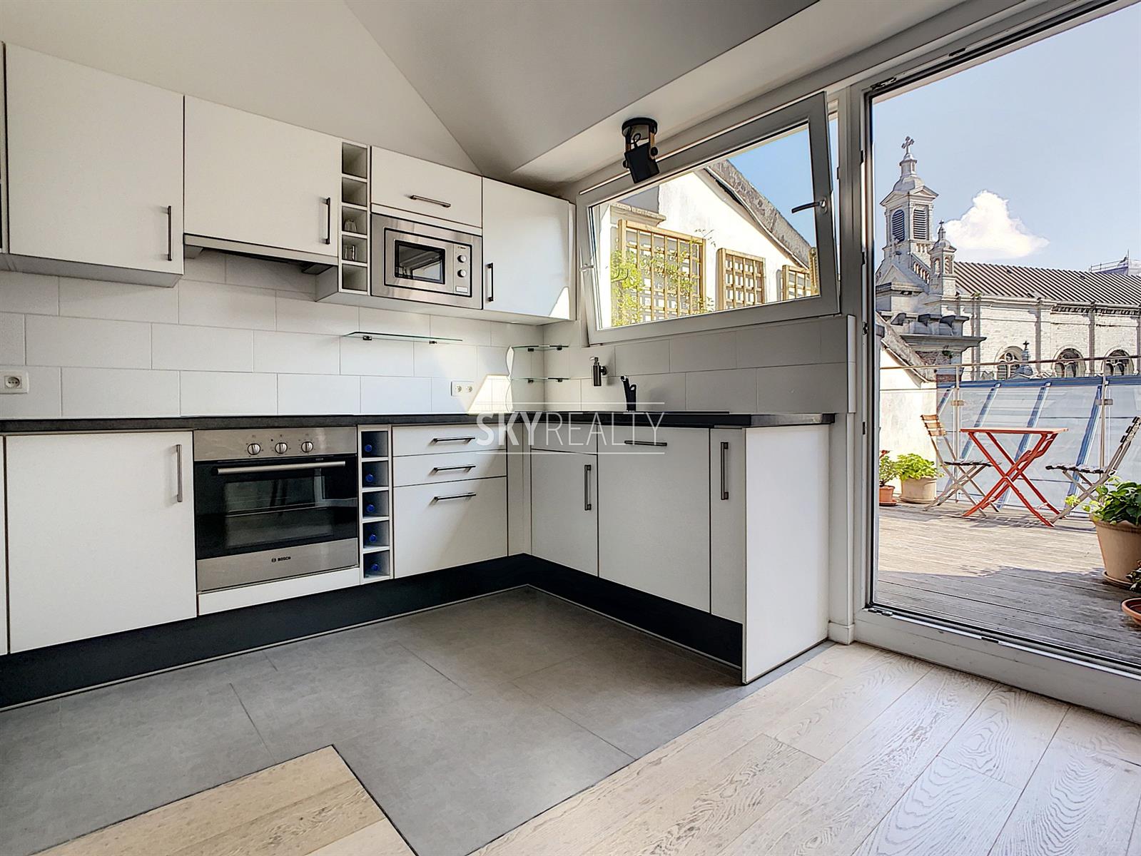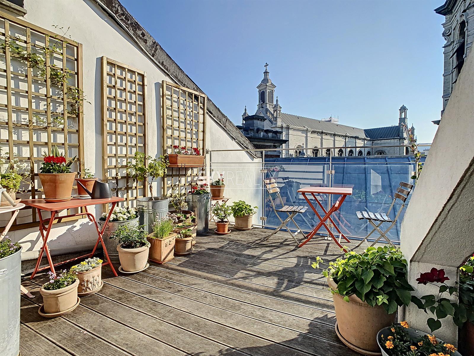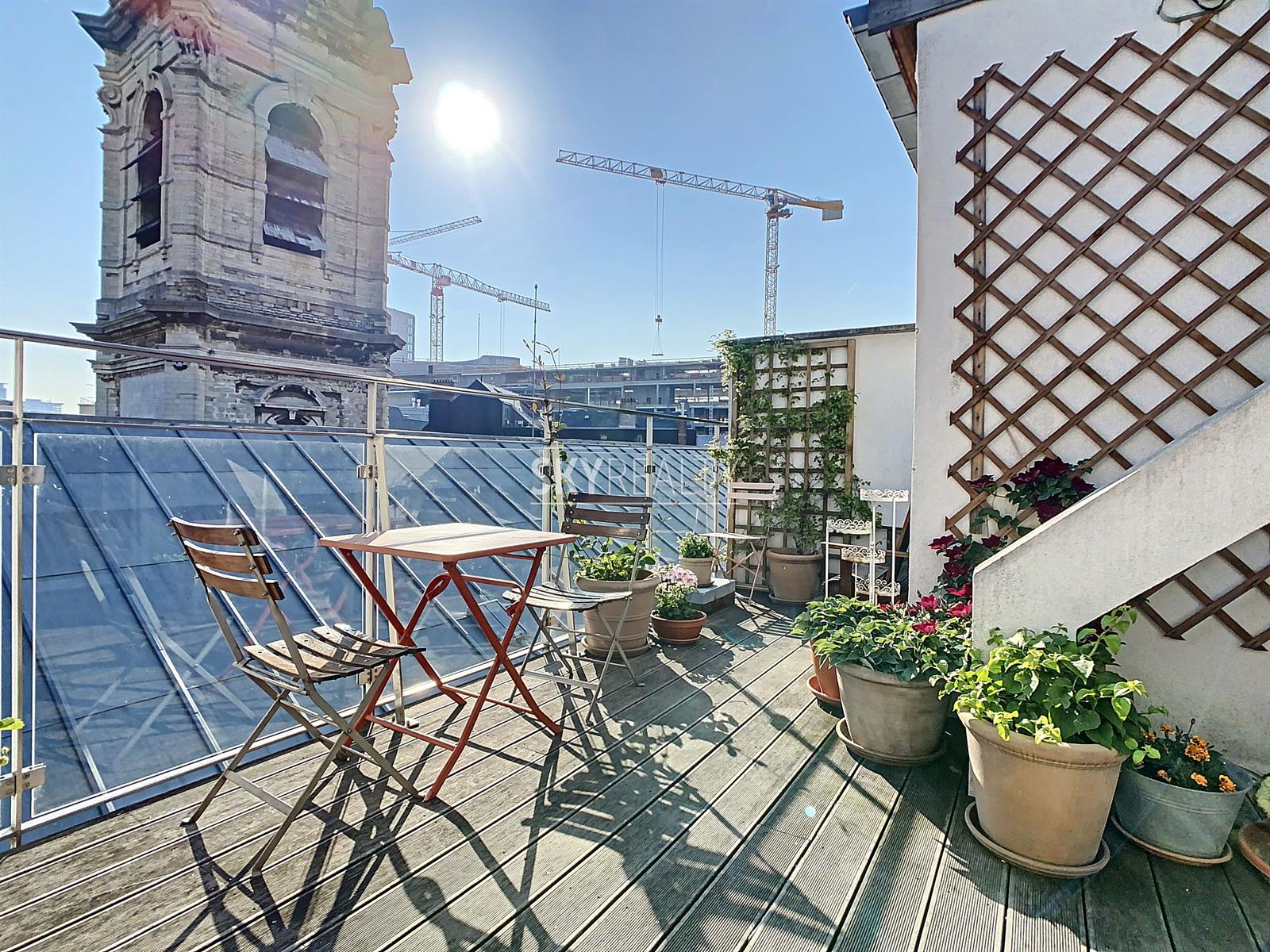 *** VENDU *** RUE SAINTE CATHERINE, À 20M DE LA PLACE DU MÊME NOM: Nous vous présentons en exclusivité ce splendide duplex penthouse (2 CH / 1 SDB / 1 SDD) de ± 110 m² (+ terrasse de 15 m²) au 4e et 5e étage (avec ascenseur) d'un petit immeuble complètement remis à neuf en 2015. Il offre: 4e étage: un hall d'entrée, une chambre à l'arrière (12 m²) avec une salle de bain en suite (bain, lavabo, radiateur porte-serviettes), une chambre en façade avant de 17,5 m² (possibilité d'en faire 2 chambres séparées), une salle de douche (douche, lavabo, radiateur porte-serviettes), une toilette séparée; 5e étage: un living traversant (belle luminosité) s'ouvrant vers une agréable terrasse, une cuisine ouverte super équipée (réfrigérateur-surgélateur, taque vitro-céramique, hotte avec extraction, lave-vaisselle, four et micro-ondes), une buanderie (option 2e toilette possible); en sous-sol: un espace pour les vélos, une grande cave avec prise de courant (recharge vélo électrique ok). Double vitrage, visiophone à chaque étage, beau parquet en chêne, électricité en conformité. Un appartement ne nécessitant aucun travaux, dans lequel l’emménagement peut être immédiat, parfait pour un célibataire, un jeune couple ou pour les investisseurs. Une petite copropriété bien entretenue de seulement 9 unités. PEB: C- ! Faible R.C./P.I. (seulement 551 € / 514 € !). Immeuble raccordé à la fibre optique Proximus ! Faire offre à partir de 450.000 €.